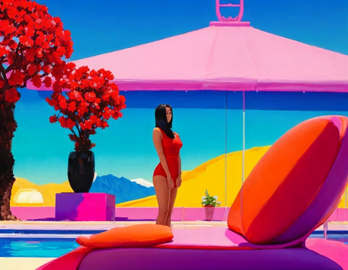 Prompt: "Hiroshi Nagai Painting+Women with Rose sitting next to a swimming pool in Palm Springs, Ca+bold Colors +Surreal+Mythic+Epic+Large Proportioned Landscape+Retro+retro Sci-Fi+Sci-Fi"