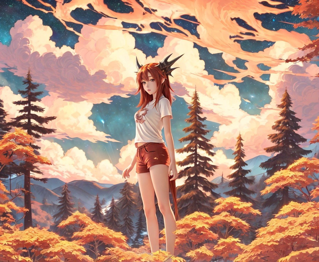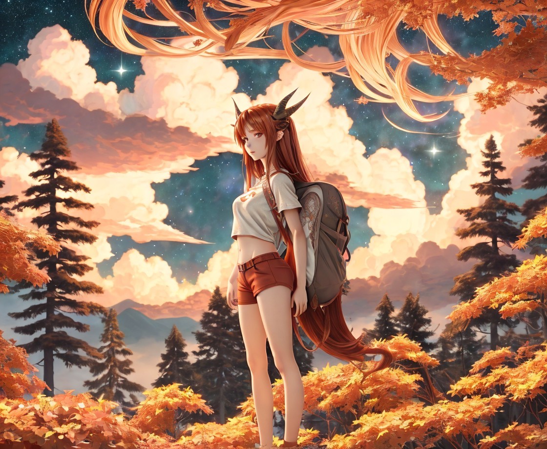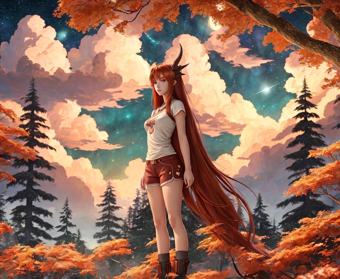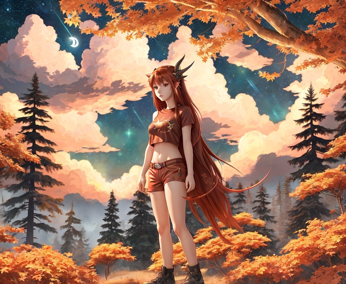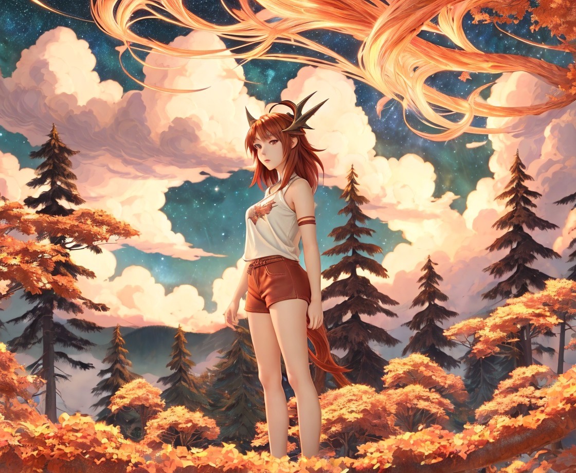 A serene figure with long, flowing hair and subtle antlers stands amidst vibrant autumn trees. The sky is painted with fluffy clouds and a glowing atmosphere, evoking a mystical and enchanting scene.