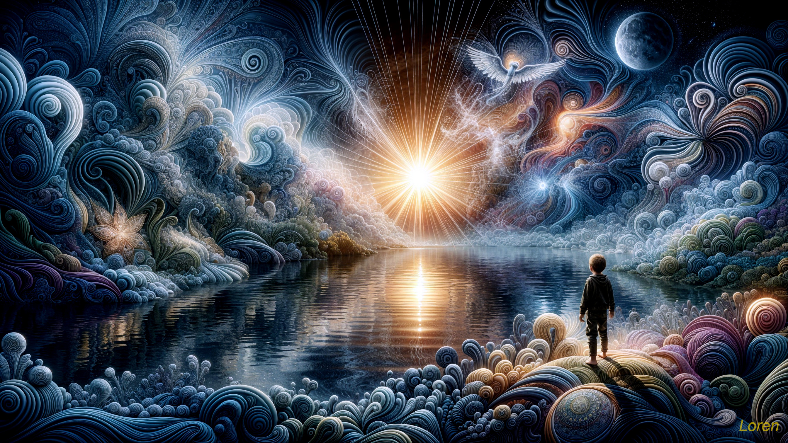 A child stands by a serene, swirling lake, surrounded by vibrant, cosmic patterns of waves and clouds. A radiant sun rises, casting light on fantastical elements in the sky and water.