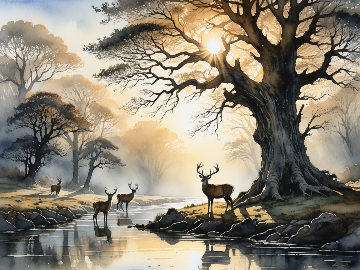 A serene landscape features majestic deer near a tranquil river, surrounded by towering trees bathed in warm sunlight and mist, creating a magical, peaceful atmosphere.