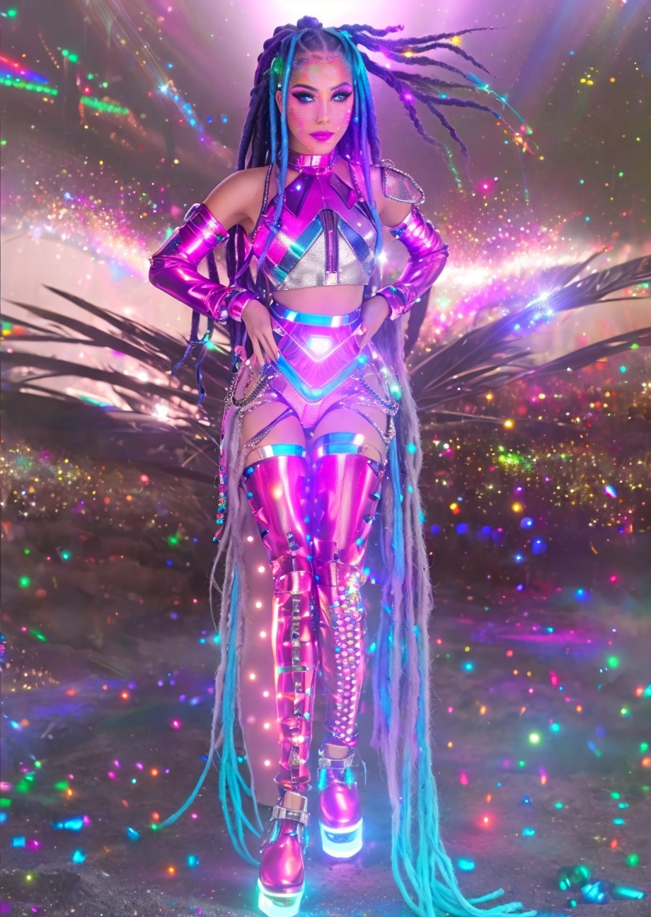 Prompt: A young woman in an electronic suit. the suit is studded, and face is covered in sparkly glittery makeup. she has dreadlocks hair, which is dyed rainbow.