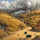The image depicts a whimsical landscape with rolling hills, golden trees, and a quaint cottage. In the background, dreamlike clouds and distant castles create a surreal atmosphere.