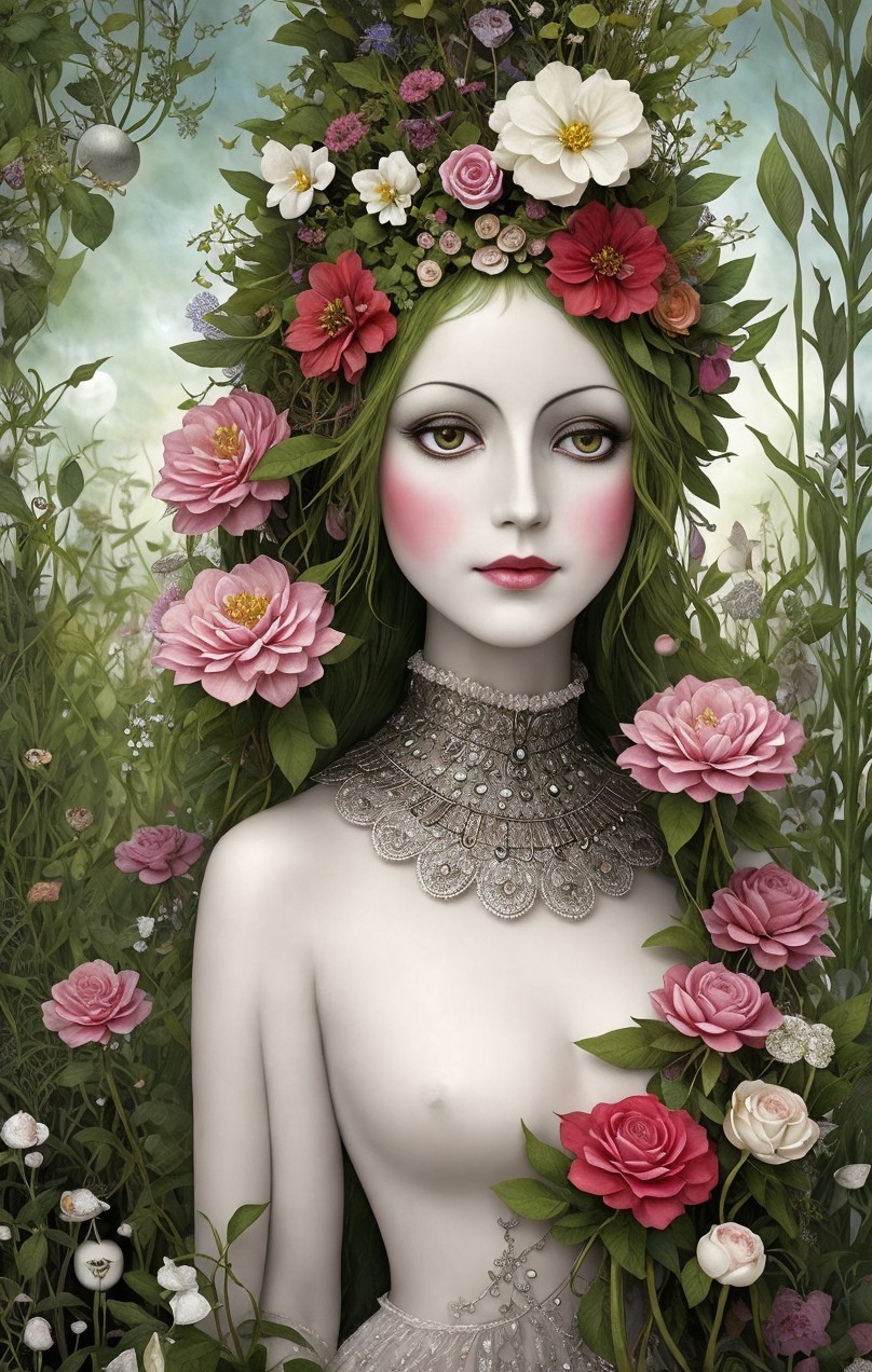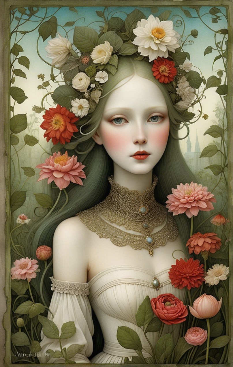 A serene woman with flowing, wavy hair adorned with flowers stands amidst lush greenery. She wears a white dress, holding a delicate flower, framed by distant castles under a soft sky.