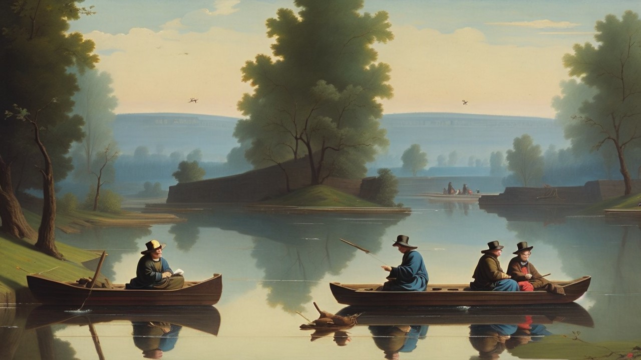 The image depicts a serene lakeside scene with several boats, each occupied by fishermen. Lush trees and a quaint building reflect calmly on the water, creating a tranquil atmosphere.