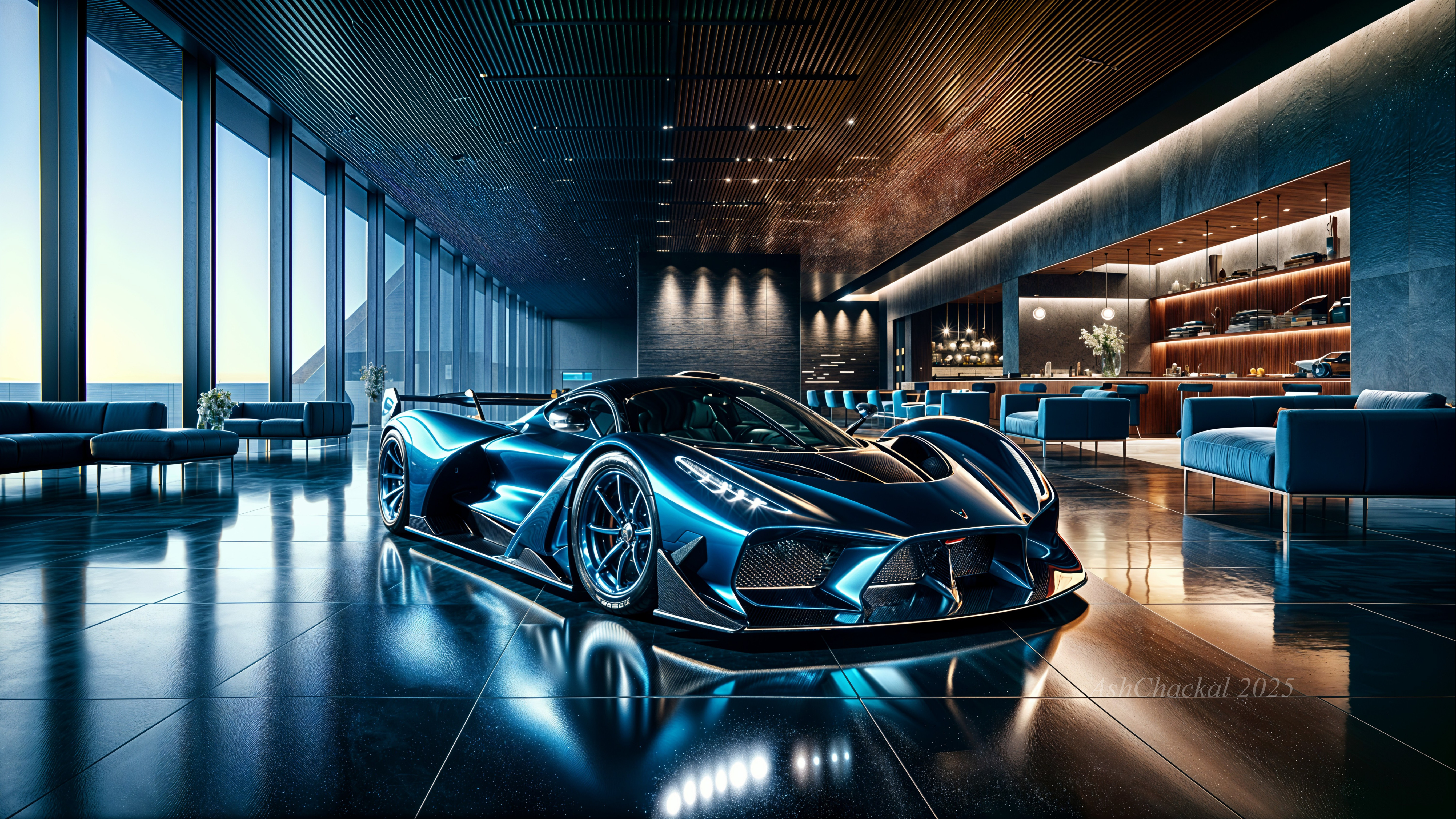 床から天井までの窓がある豪華でモダンなロビーにある、洗練された未来的なスポーツカー。車の光沢のあるブルーの仕上げは、スタイリッシュなインテリアと周囲の照明を反映しています。