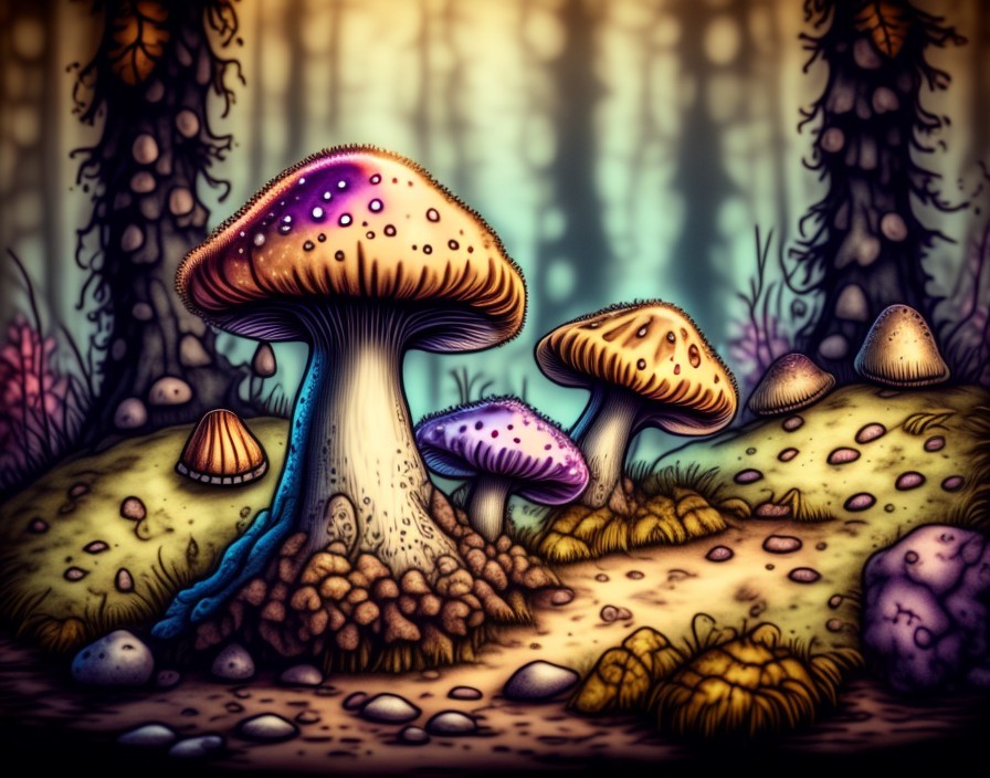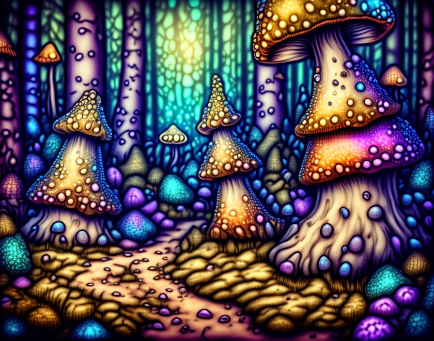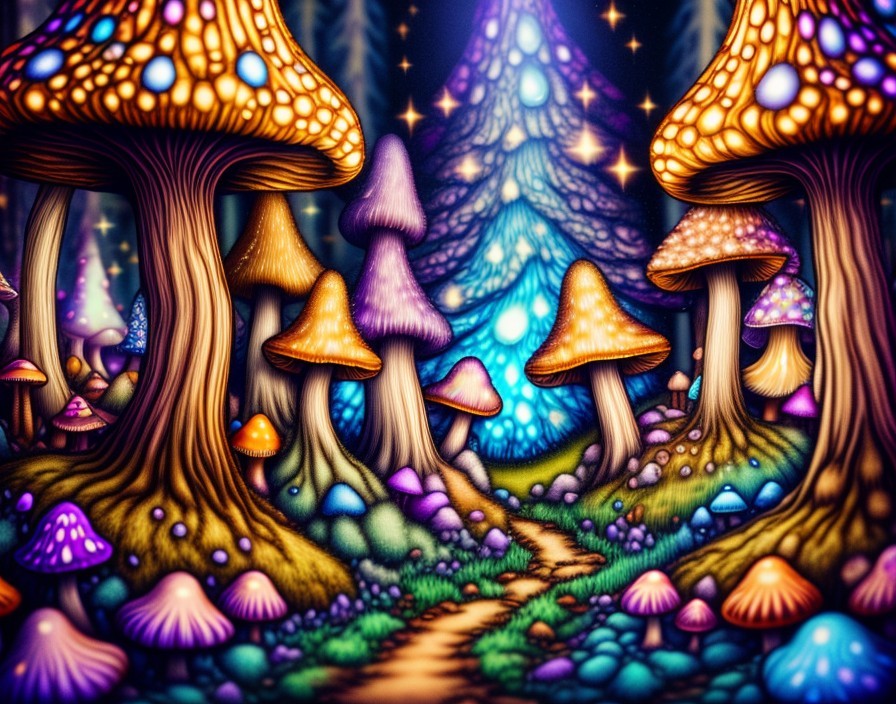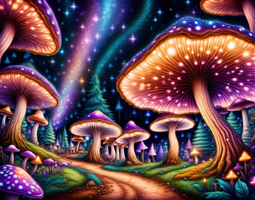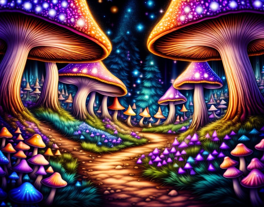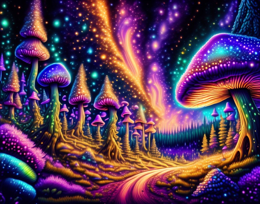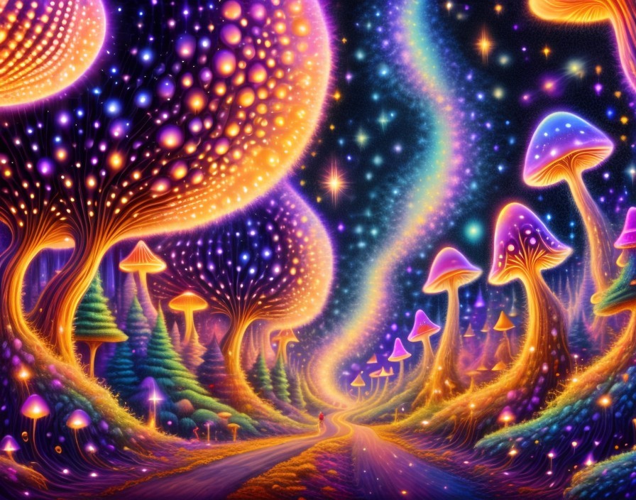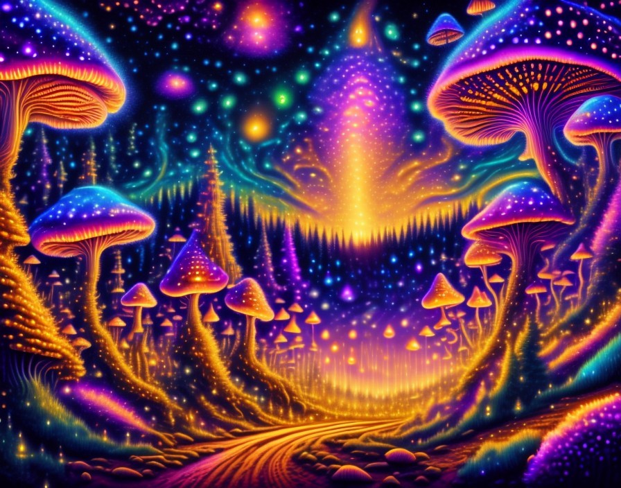 A vibrant, psychedelic illustration of a path flanked by glowing, oversized mushrooms under a starry sky.
