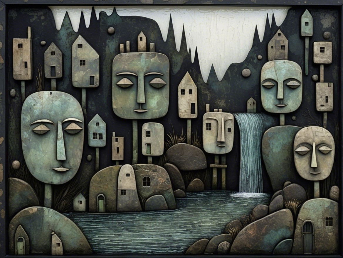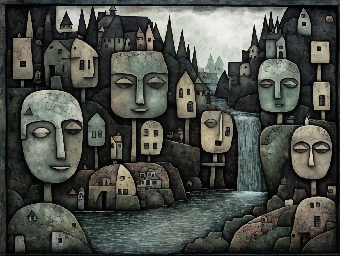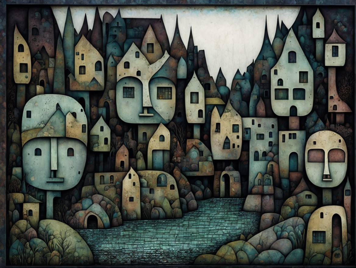 The image features a whimsical landscape of abstract houses with human-like faces, nestled among hills and a serene river, all depicted in muted earthy tones and textured patterns.