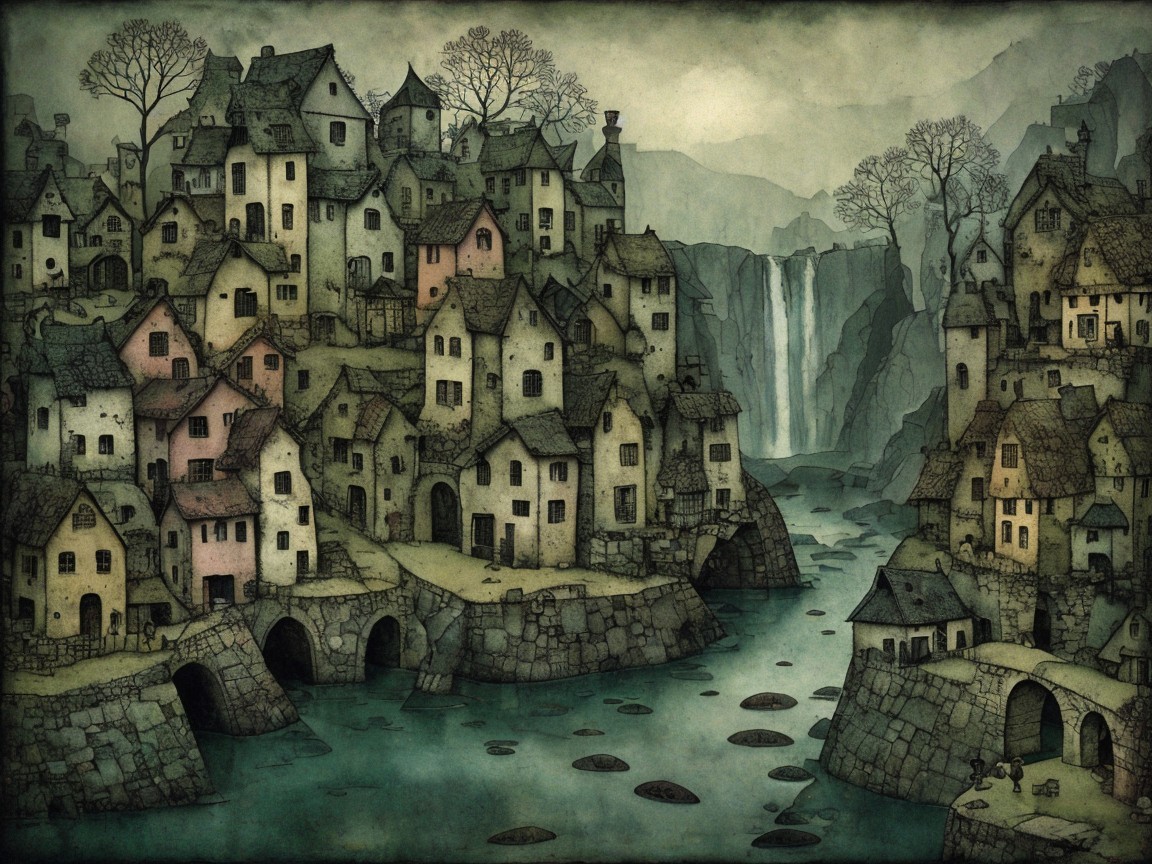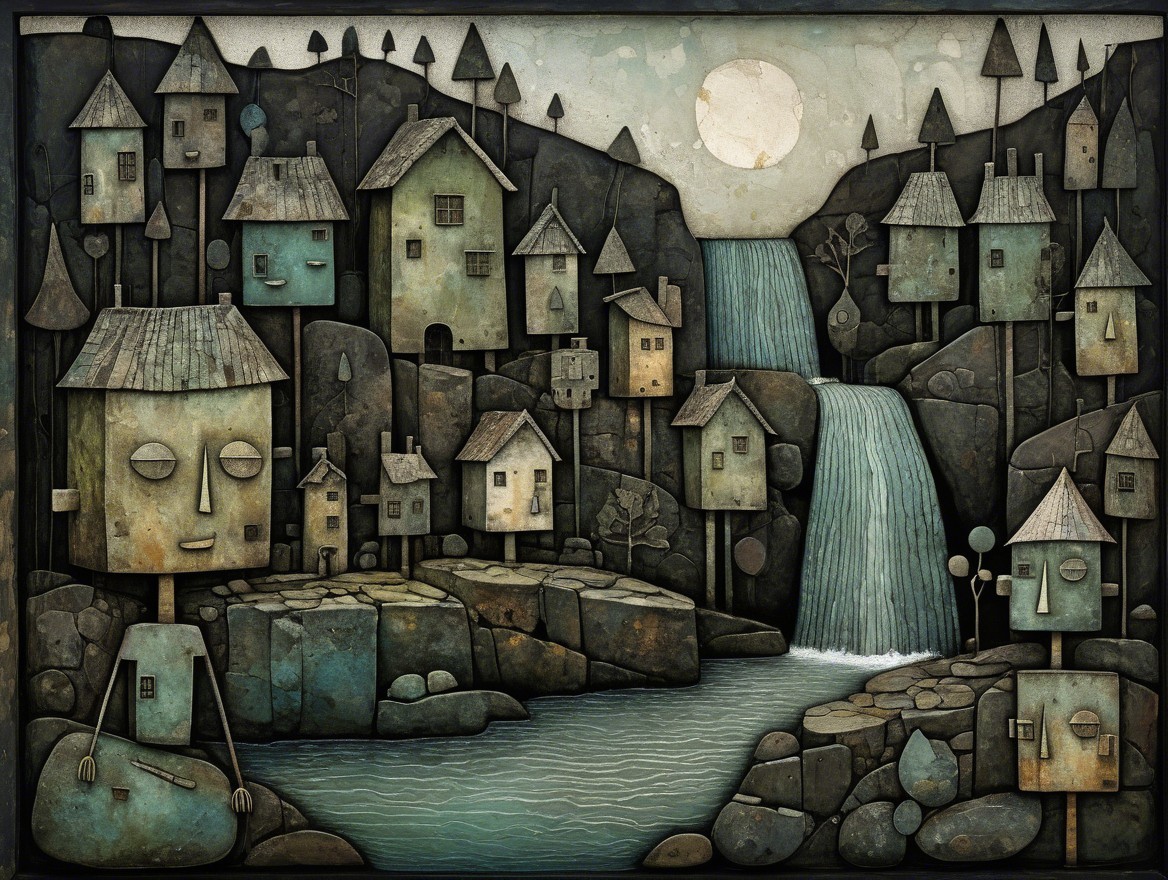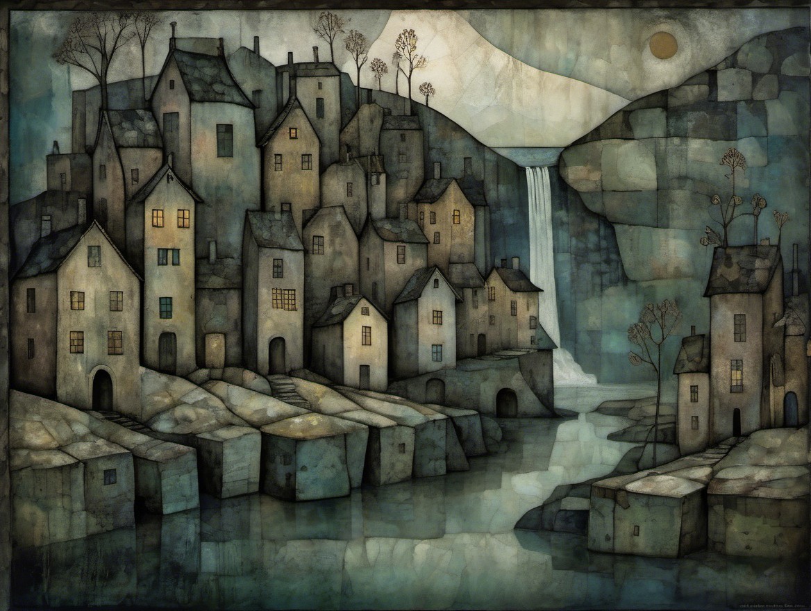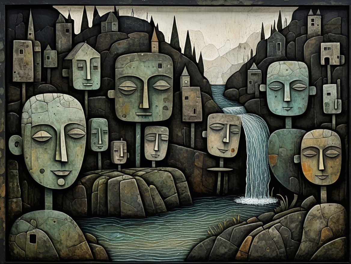 The image features a whimsical landscape of abstract houses with human-like faces, nestled among hills and a serene river, all depicted in muted earthy tones and textured patterns.