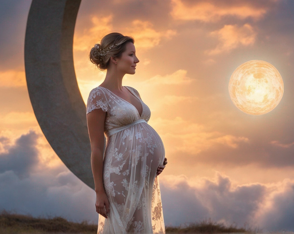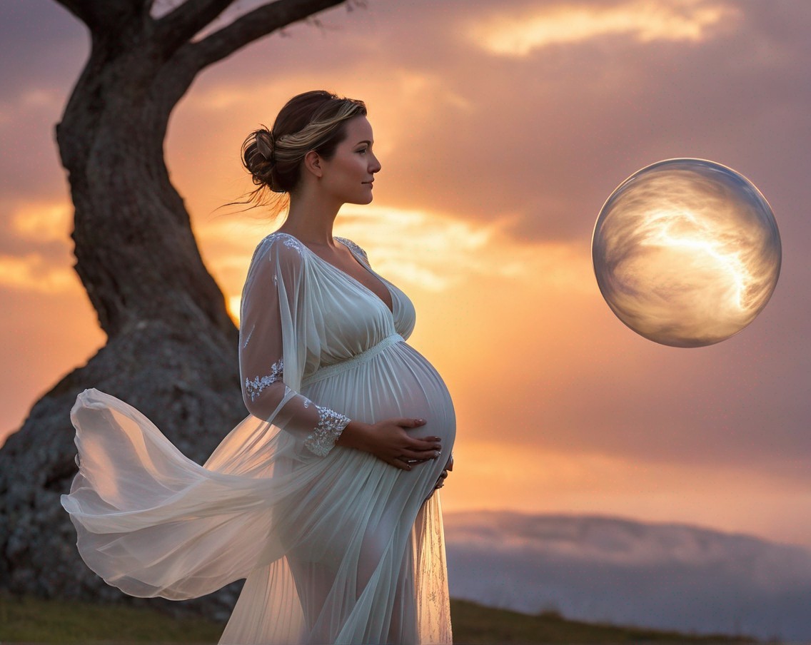 A painting of a serene woman holding a luminous orb against a backdrop of a sunset sky and rolling landscape.