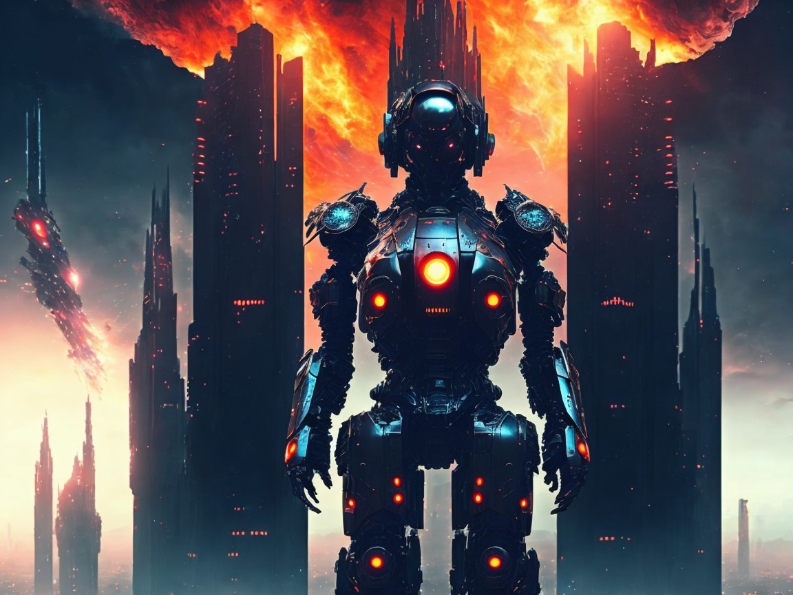 Humanoid robot, futuristic cityscape, destruction, chaos, power, authority, rebellion, technology, wealthy elite, inequality, skyscrapers, flames, explosions, fear-stricken crowds, high-tech weapons, dystopian setting, dark and ominous atmosphere, metallic textures, glowing red eyes, sharp angles, dynamic composition, digital art, detailed and intricate design, dramatic lighting with shadows, by Simon Stålenhag and Syd Mead, Artstation."