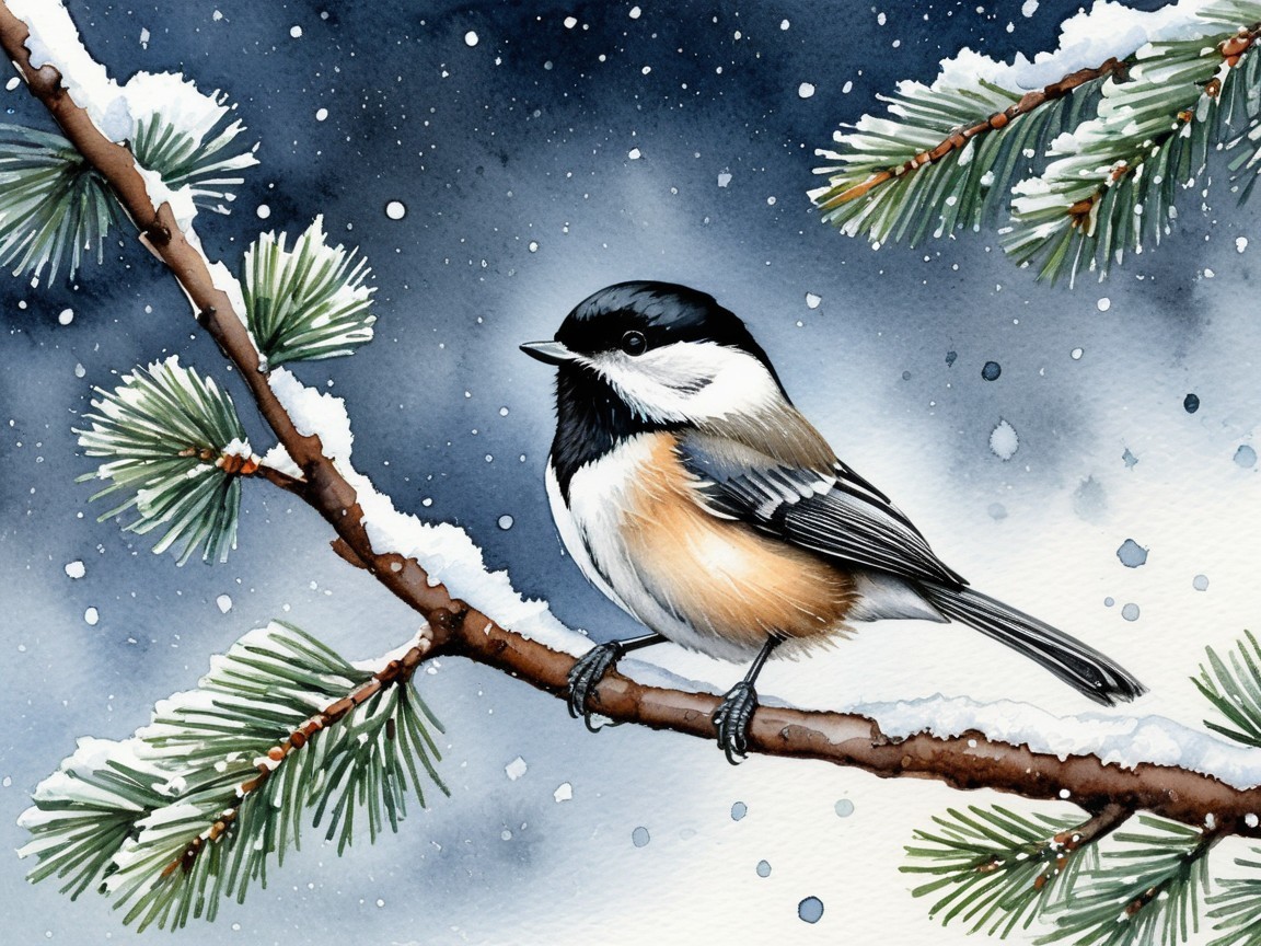 A charming bird perched on a snow-covered pine branch. It features a distinctive black and white head, with warm orange tones on its chest, set against a serene wintery backdrop of falling snow.