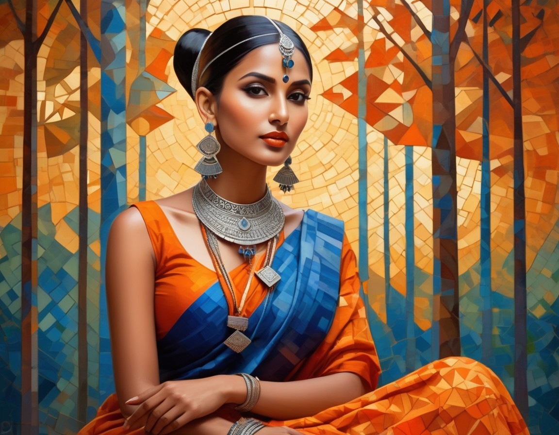 Prompt: "Geometric female figure, Cubist forest setting, Rich blue skin tone, Burnt orange traditional Indian attire, Full lips, Straight nose, Deep-set eyes, Serene expression, Elegant bun hairstyle, Long earrings, Layered silver necklace, Mosaic-style forest background, Greens, blues, yellows, oranges palette, Kaleidoscopic effect, Sunlight filtering through, Seated pose, Orange and brown patterned bands, Elongated unlit candle, Drip of wax, Old ornate books, Pomegranate with seeds, Clear glass cup, Ribbed gourd, Vibrant red flowers and fruits, Harmonious balance, Abstract natural environment."