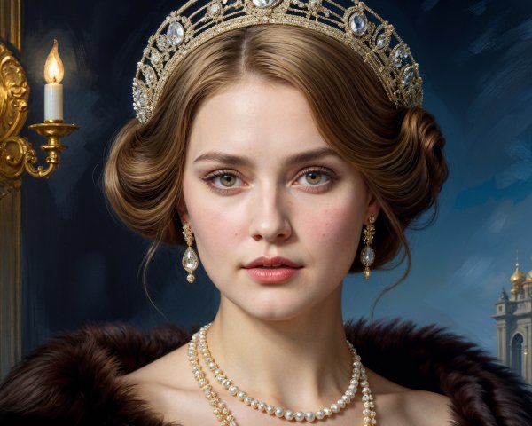 A young woman gazes softly, adorned in a regal gown with intricate jewelry. Her crown and elegant attire reflect opulence, set against a serene twilight backdrop.
