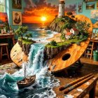 A creative art piece shaped like a painter's palette, featuring a scenic landscape with a lighthouse, crashing waves, and a sailboat, all illuminated beautifully in a cozy studio setting.