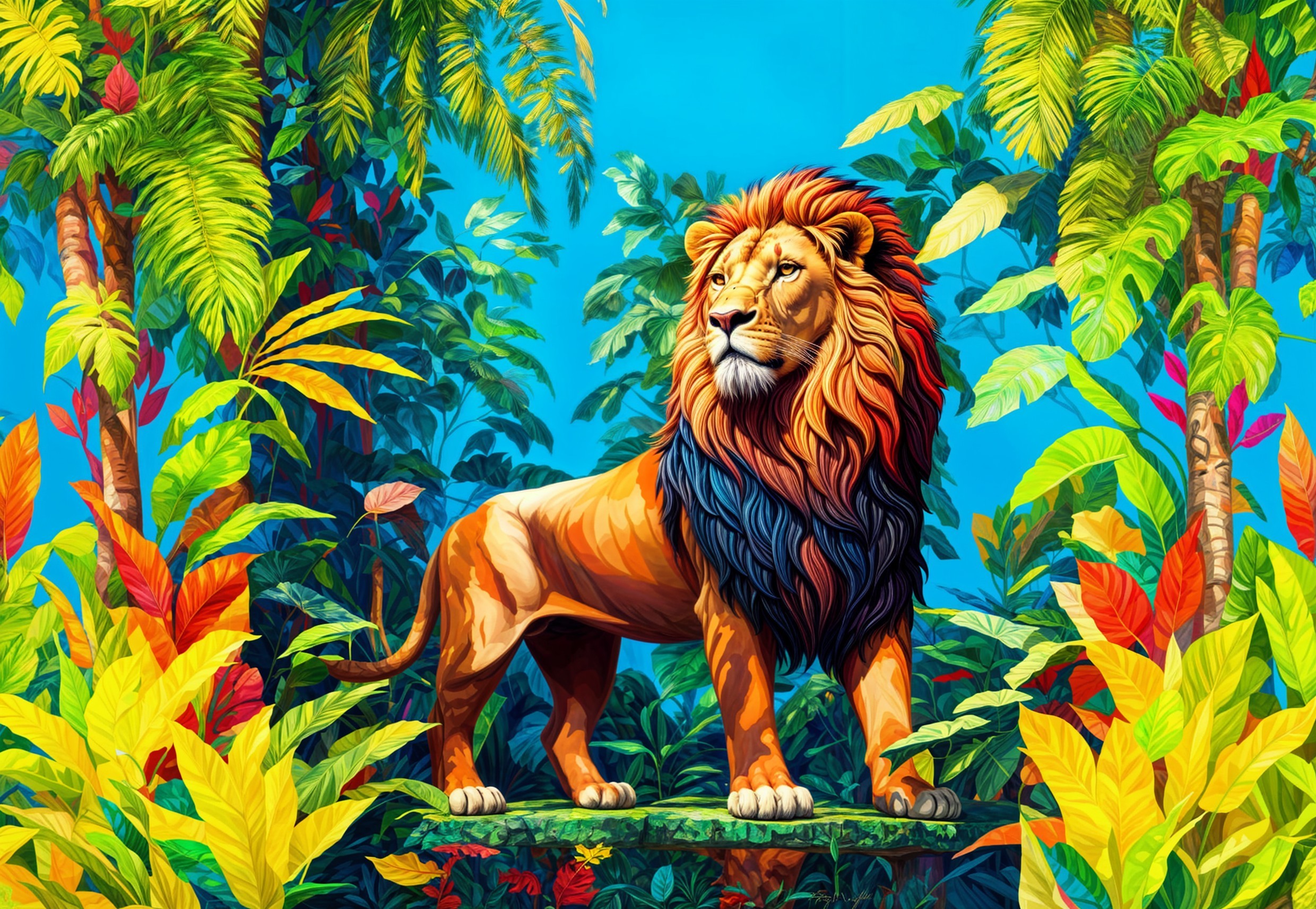 A majestic lion stands proudly in a vibrant, lush jungle. Surrounded by colorful tropical plants and trees, its flowing mane contrasts beautifully with the vivid greenery and blue backdrop.