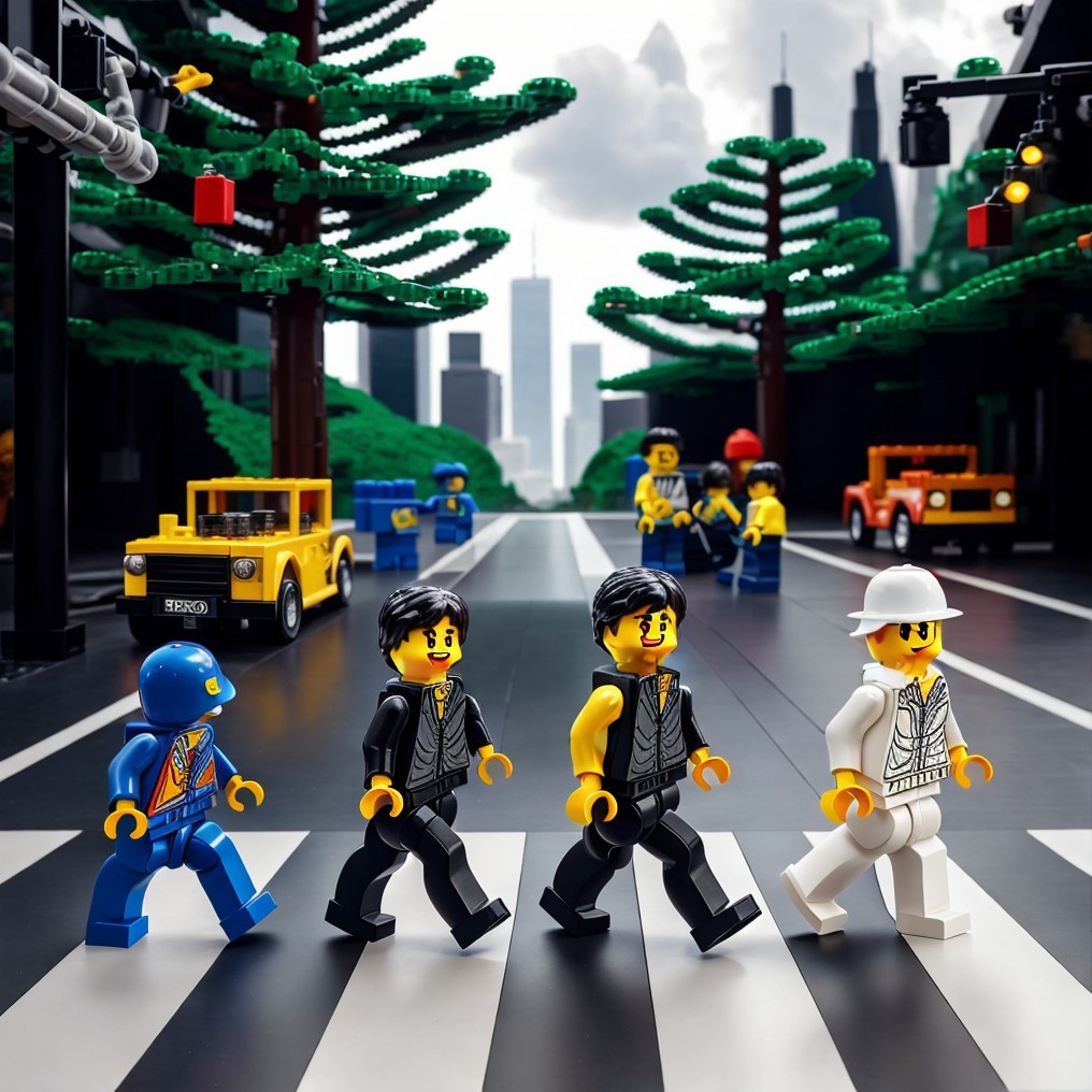 A vibrant LEGO scene with minifigures crossing the street, taxis in the background, and festive decorations suggesting a lively city vibe.