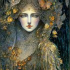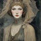A young woman adorned with autumn leaves and delicate webs stands before a dark doorway. Her serene expression contrasts with the intricate spiderwebs and a small spider resting on her chest.