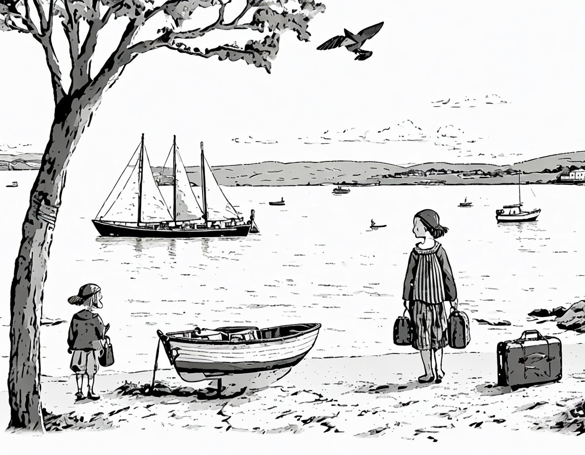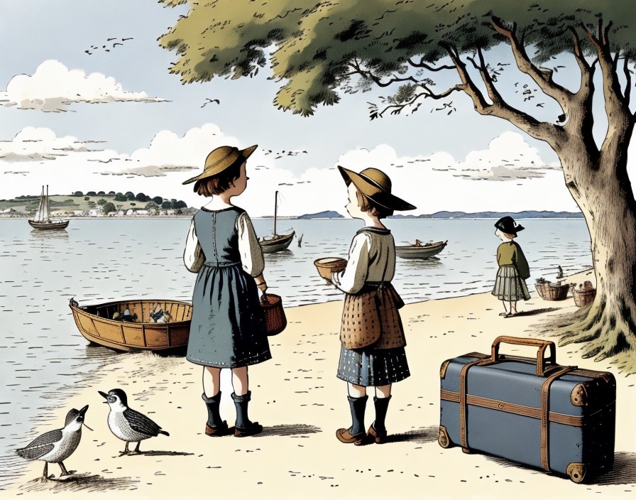 Prompt: a painting of a child and luggage, whimsical figures, in the style of Quentin Blake and Dee Nickerson, grungy patchwork, life-like avian illustrations, seaside vistas, romantic gestures, quirky shapes, romantic illustrations