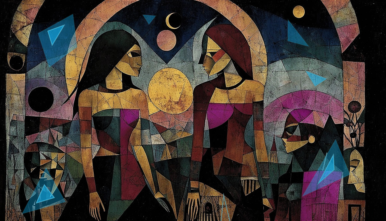 The artwork features two stylized women with geometric shapes and vibrant colors, set against a celestial backdrop. A moon, stars, and flowers enhance the mystical atmosphere.