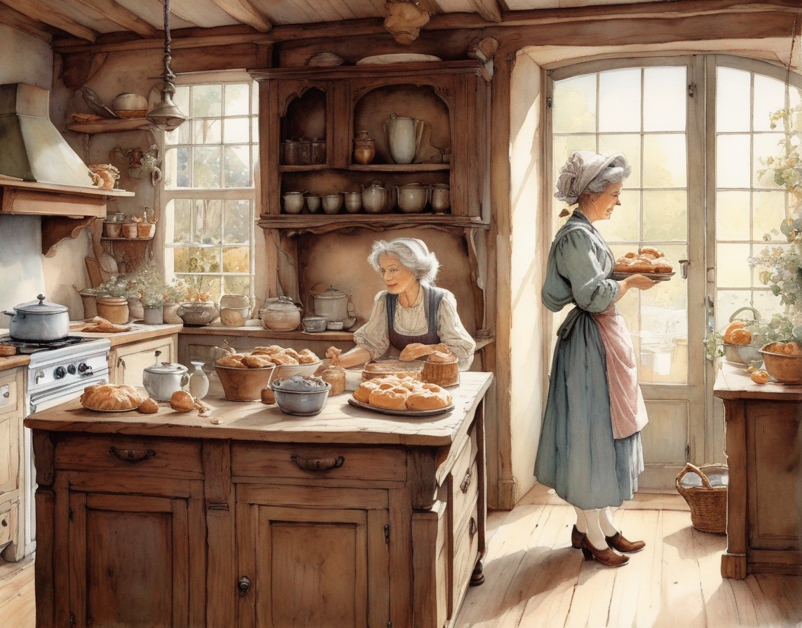 Two women in a cozy kitchen, surrounded by baked goods and earthenware, sharing a peaceful baking moment.
