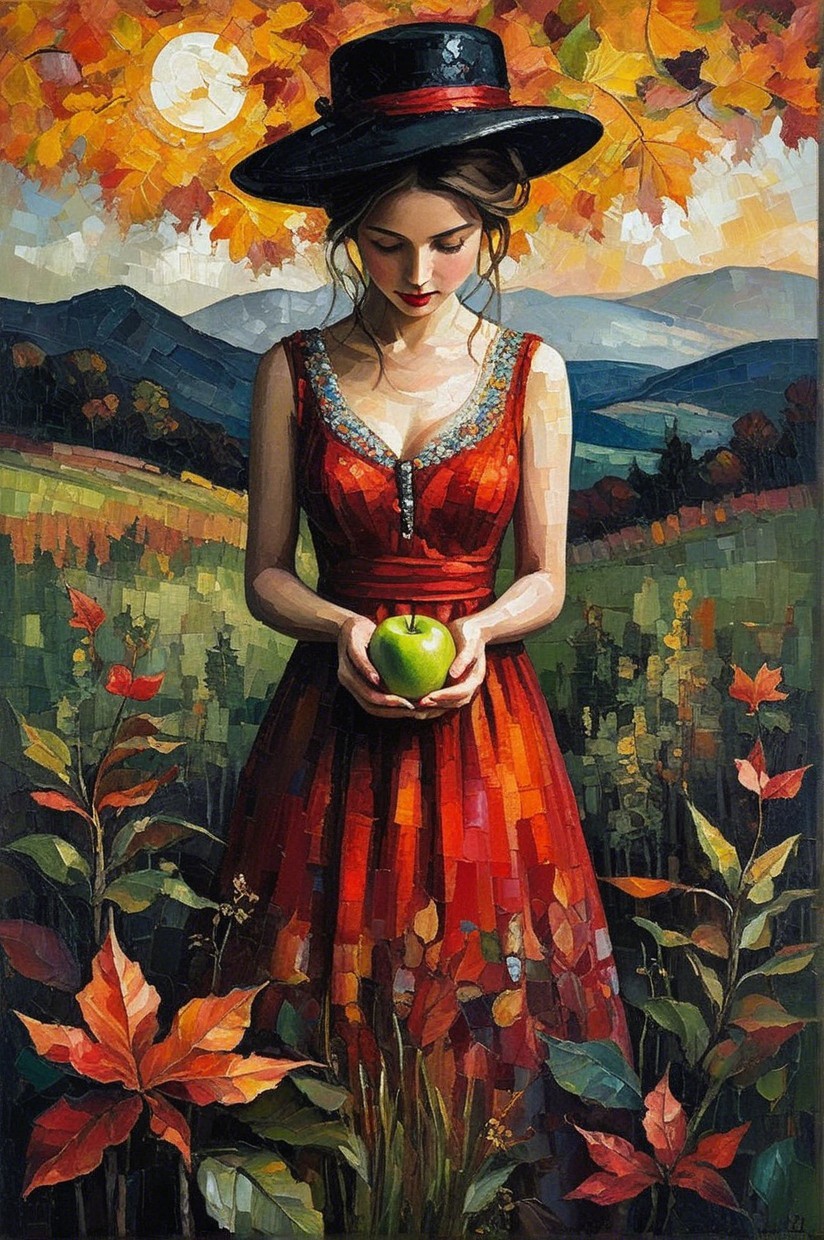 A woman in a striking red dress holds a green apple, surrounded by vibrant autumn foliage and rolling hills. Her black hat contrasts with the colorful landscape, enhancing the enchanting scene.