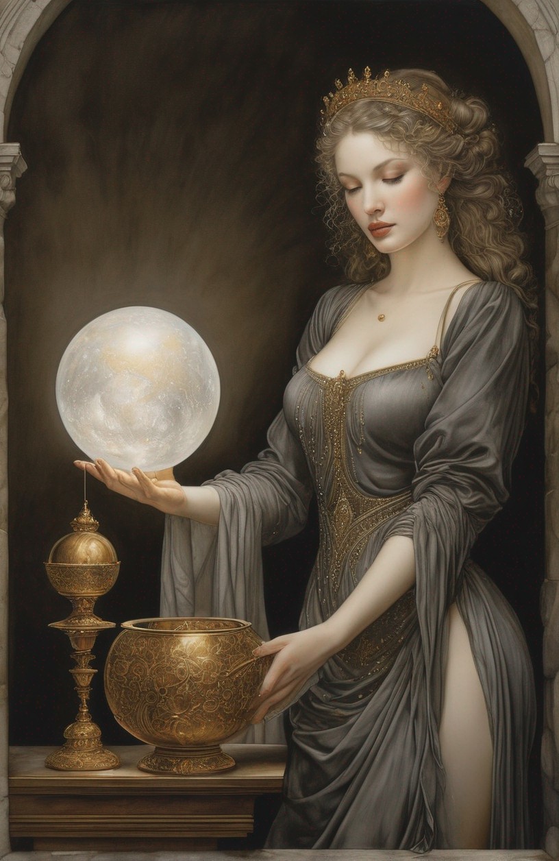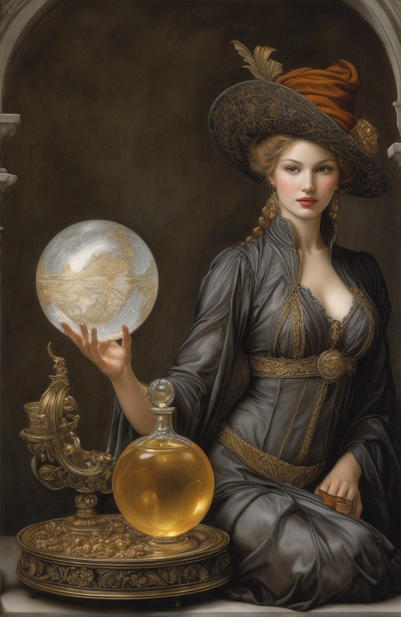 An elegant woman in historical attire holds a globe with a ship, adorned with ornate jewelry and a headpiece.