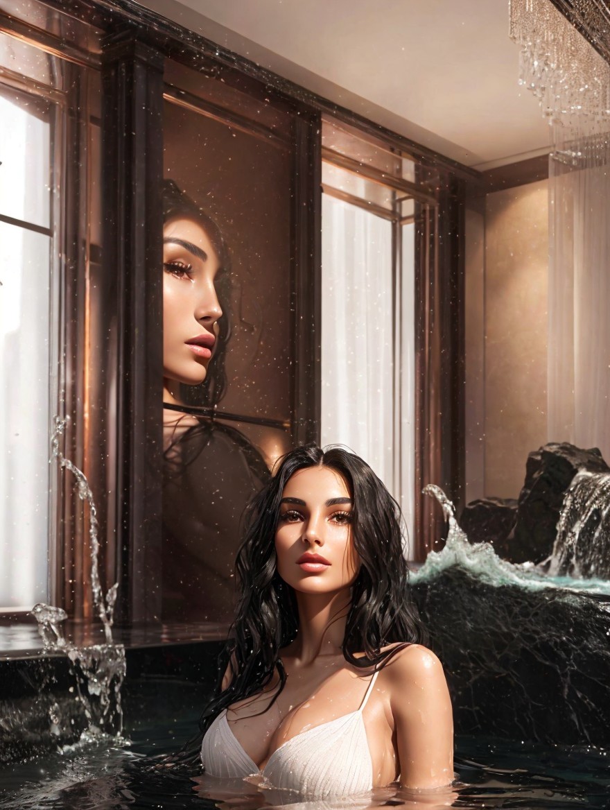 A photorealistic image of a young woman with olive skin and a slender body shape, located in a luxurious room. The woman appears to be seated in a body of water, possibly an indoor pool, with the water level reaching just below her chest. She has long, black, wavy hair cascading down her shoulders and back. Her facial features are delicate with well-defined eyebrows, large, almond-shaped brown eyes, a straight nose, and full lips slightly parted. She is wearing subtle makeup that enhances her features, with prominent eyeliner and a natural color on her lips.