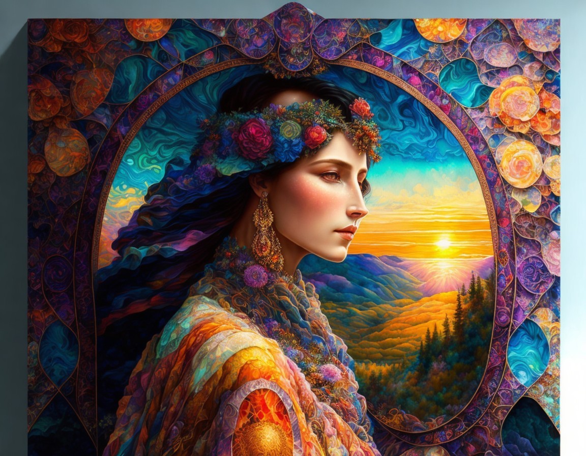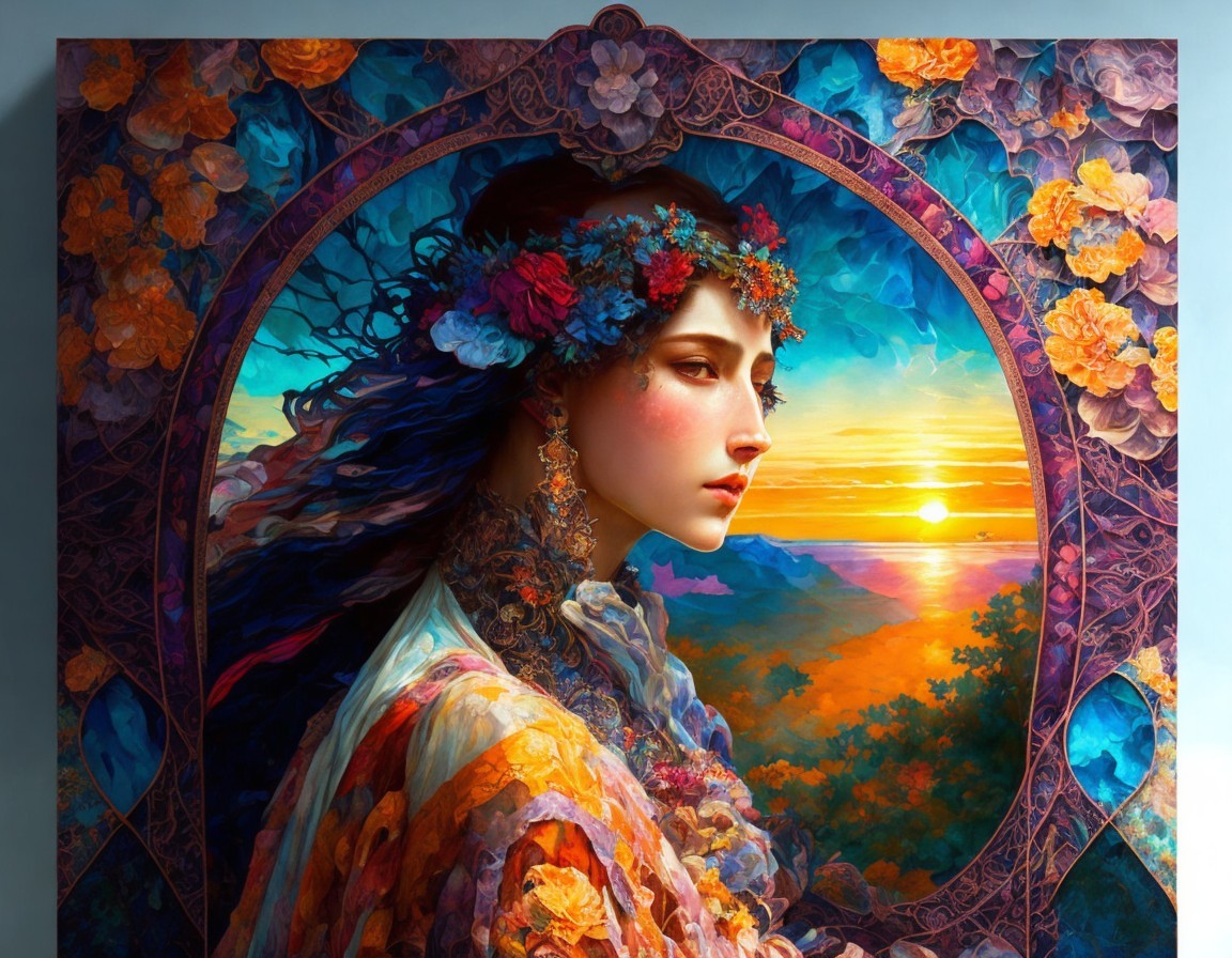A stunning portrait of a woman adorned with floral accessories, set against a vibrant, swirling landscape at sunset. The artwork combines intricate details and rich colors, evoking a mystical atmosphere.