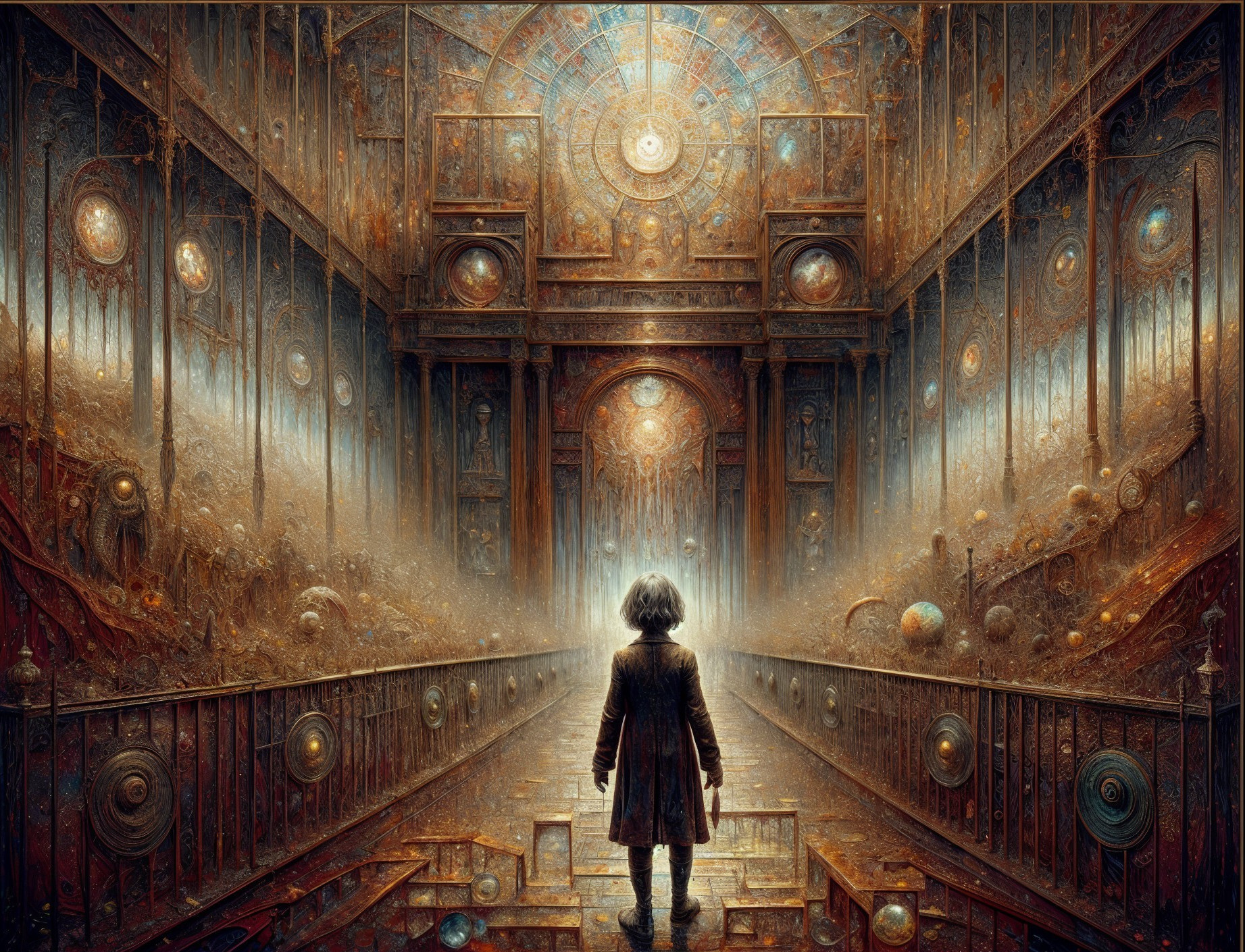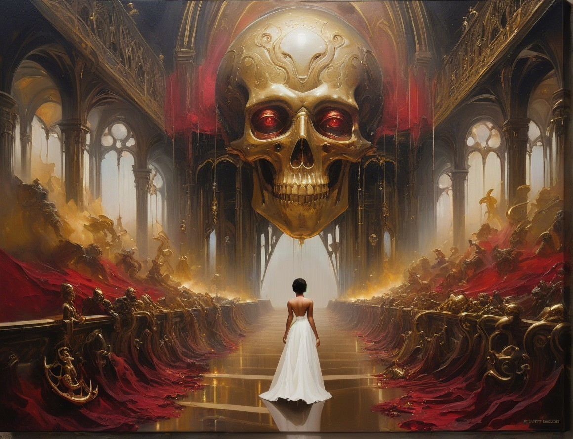 A Maximalist composition, (((Crimson, brass, ochre and sepia colour palette))). Oil on Canvas.