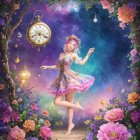 A whimsical figure twirls in a vibrant, celestial-themed dress, surrounded by planets and flowers. Her blue, curly hair is adorned with floral accents, enhancing the enchanting atmosphere.