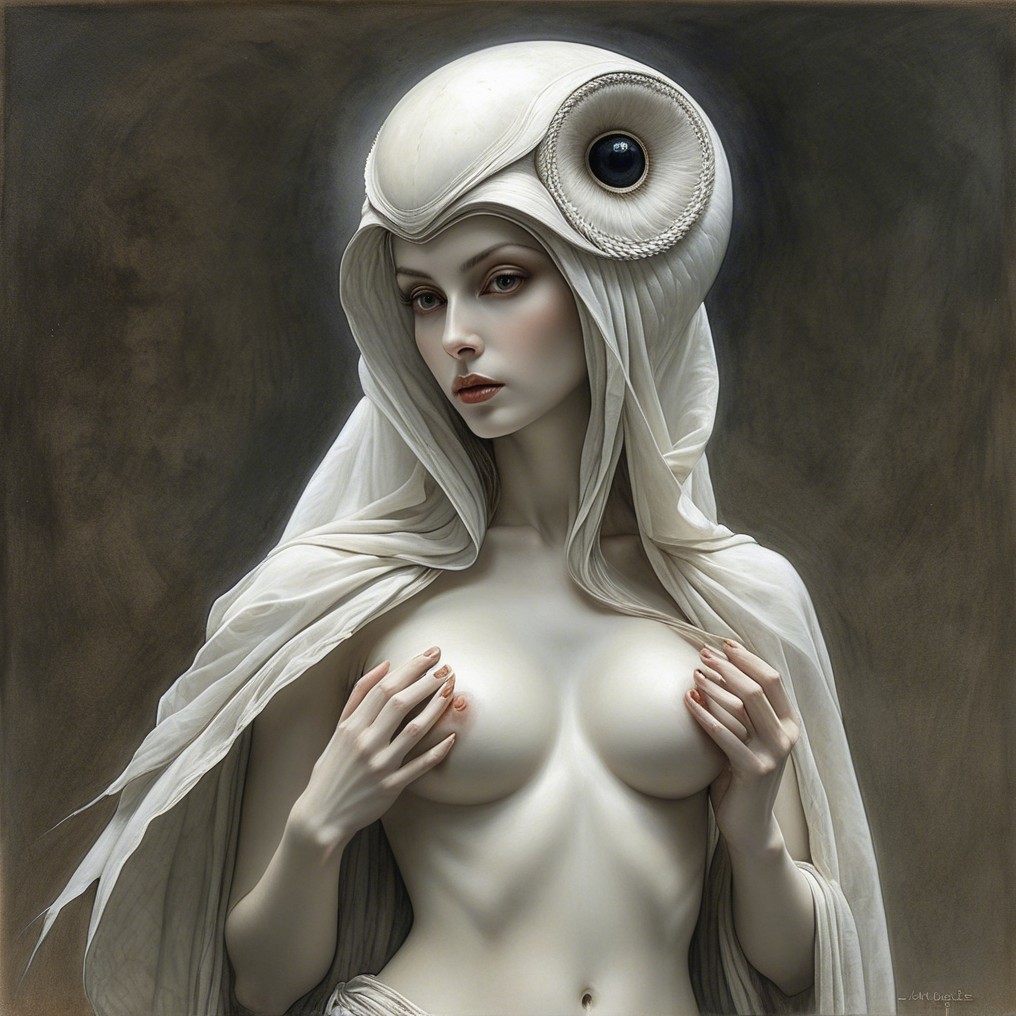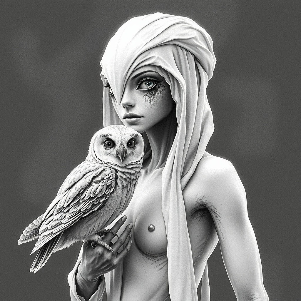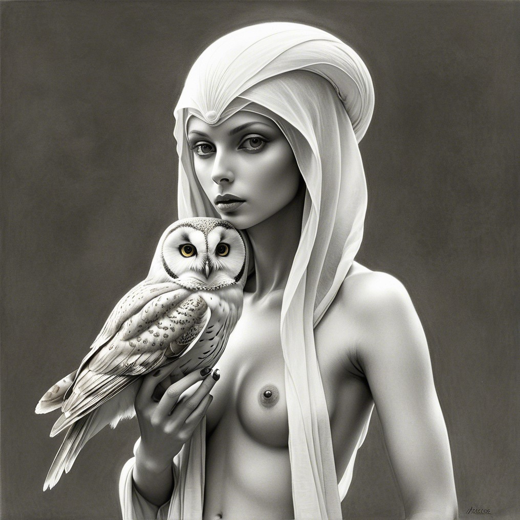 A woman in a fantasy setting wears an owl-themed headdress, a white veil, and an ornate corset, with stars and arches in the background.