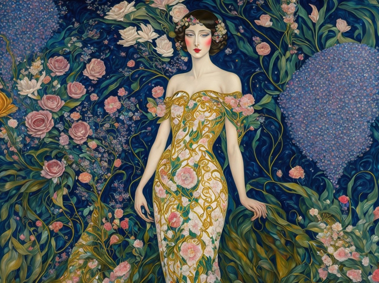 Prompt: "The artwork showcases a captivating depiction of a graceful and alluring lady adorned in a sophisticated floral gown, created in the Art Deco style by renowned artists such as Annigoni, Egon Schiele, Milo Manara, Botticelli, Catrin Welz-Stein, Jean Metzinger, and Klimt. The painting portrays a nocturnal landscape with a mesmerizing iridescent sky, devoid of any architectural structures, adhering to the principles of the golden ratio. The inclusion of meticulously crafted fictitious elements adds a touch of intrigue to the composition, aligning with the current trends observed on platforms like Pixiv Fanbox. The artist skillfully employs an acrylic palette knife technique, reminiscent of the distinctive styles seen in the works of Makoto Shinkai, Studio Ghibli, Genshin Impact, James Gilleard, Greg Rutkowski, Chiho Aoshima, Tamara de Lempicka, and Georgia O'Keeffe."