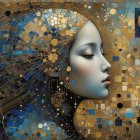 A serene side profile of a woman adorned with golden feathers and intricate jewelry, set against a gold and blue geometric background, exuding elegance and tranquility.