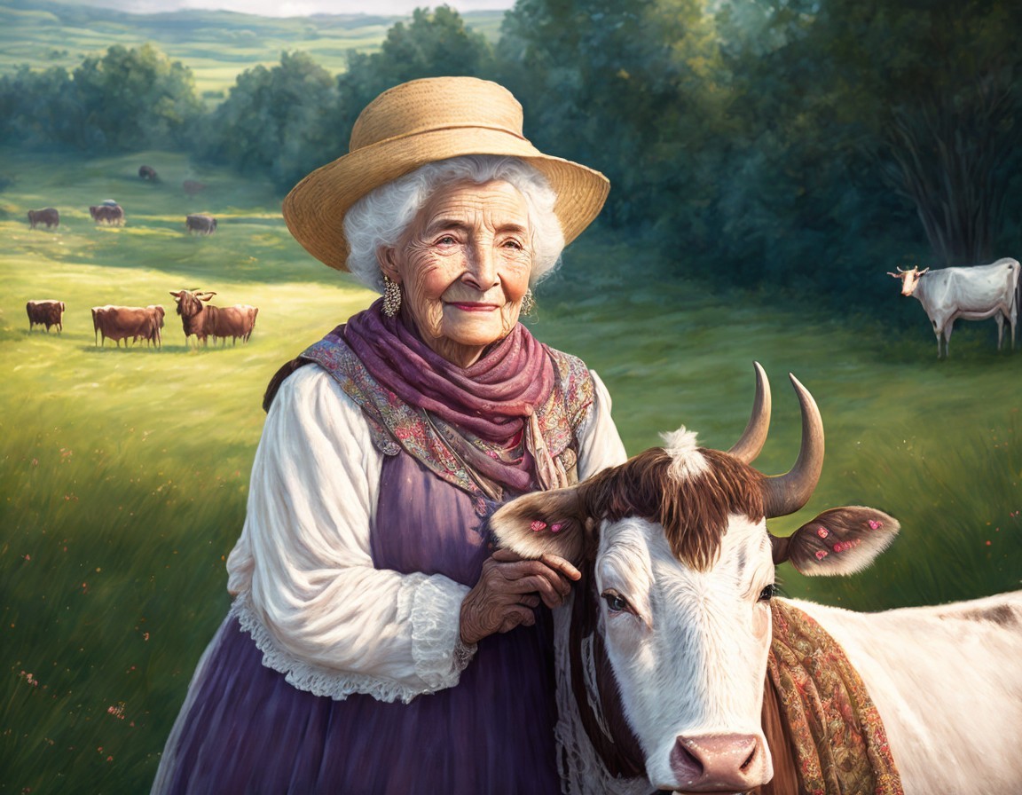 An elderly woman in traditional attire smiles gently as she pets a cow in a sunny pastoral setting with barns and cattle in the background.