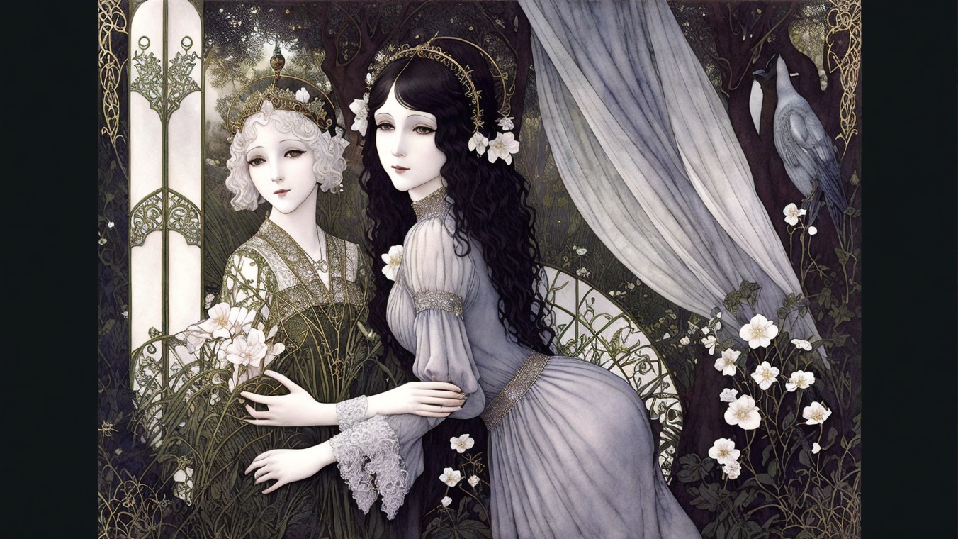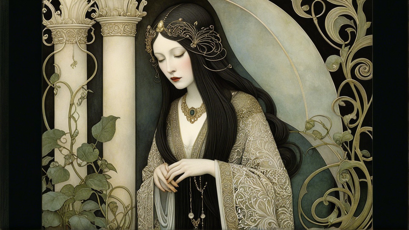 A serene woman with long, dark hair adorned with decorative accessories stands amidst lush foliage and elegant columns, embodying beauty and grace in a softly illuminated setting.