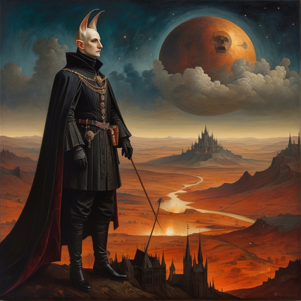 A regal figure dressed in dark, ornate attire stands holding a staff, overlooking a vast landscape with a river, distant castles, and a surreal celestial body looming above in a dramatic sky.