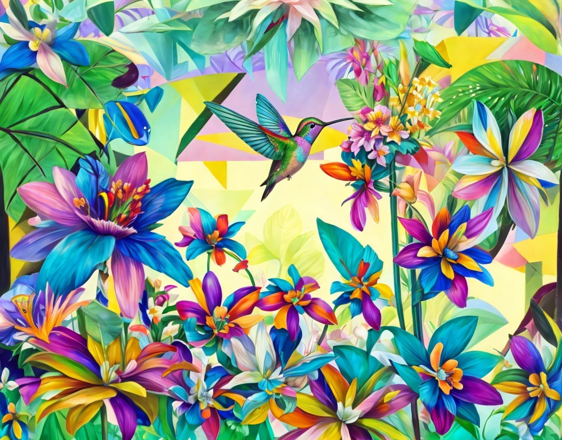 A vibrant, colorful scene filled with lush flowers in various hues, featuring a hummingbird mid-flight among tropical blooms, creating a lively and tropical atmosphere.