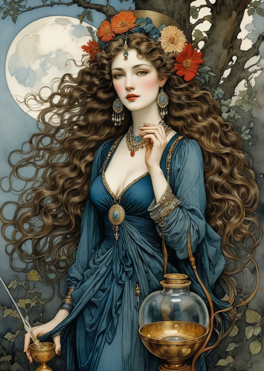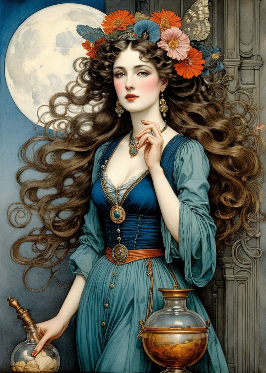 A mystical woman with flowing hair and a blue gown sits amid glass jars in a dimly lit apothecary. The full moon glows behind her, enhancing the enchanting atmosphere.
