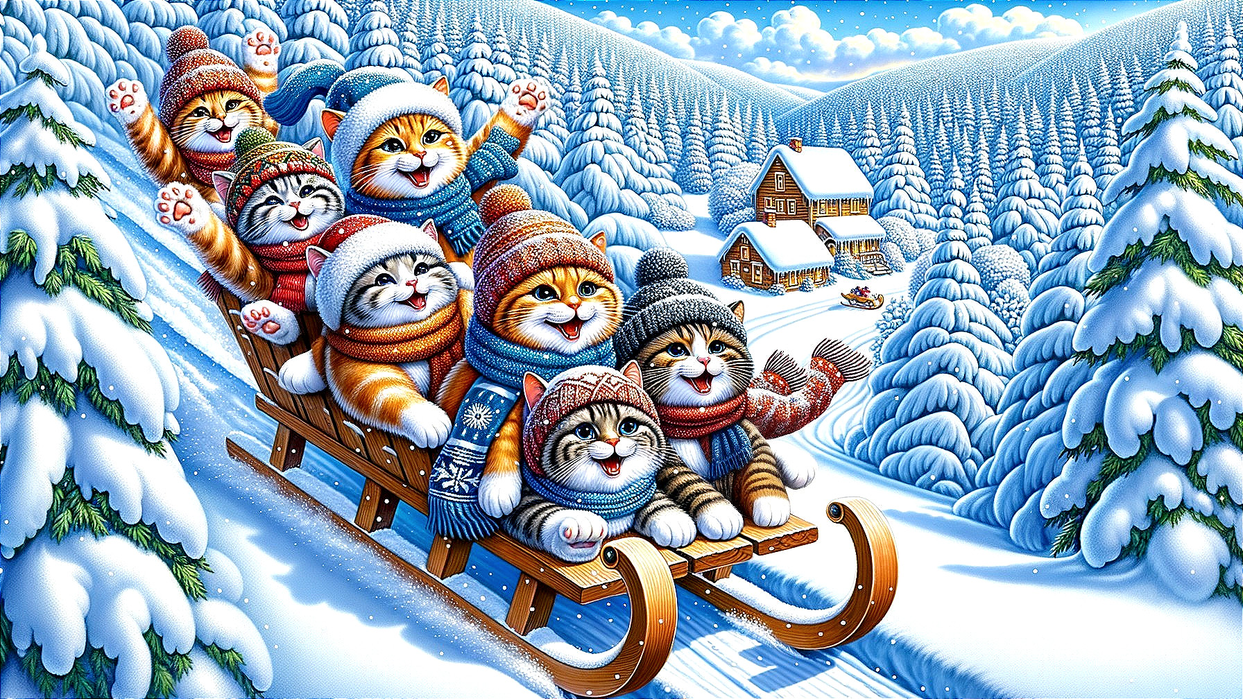 A joyful group of kittens, wearing colorful winter hats and scarves, slide down a snowy hill on a sled. A cozy cabin and snow-covered trees fill the cheerful winter landscape.