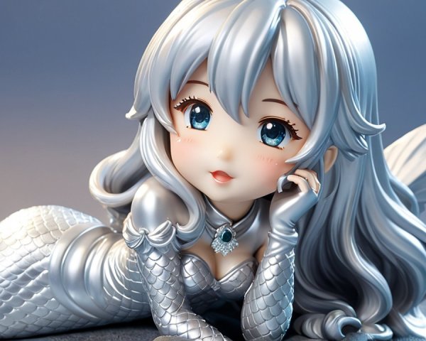 A charming anime-style mermaid adorned in shimmering silk, featuring vibrant colors and intricate details. Her flowing hair and playful expression capture the essence of whimsy and magic.