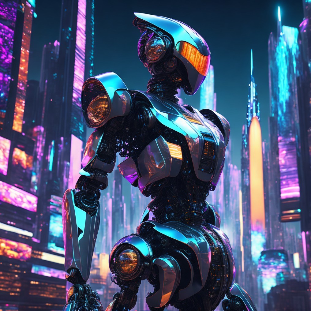 A futuristic robot with a sleek design stands before a neon-lit cityscape at dusk, its head resembling a streamlined helmet.