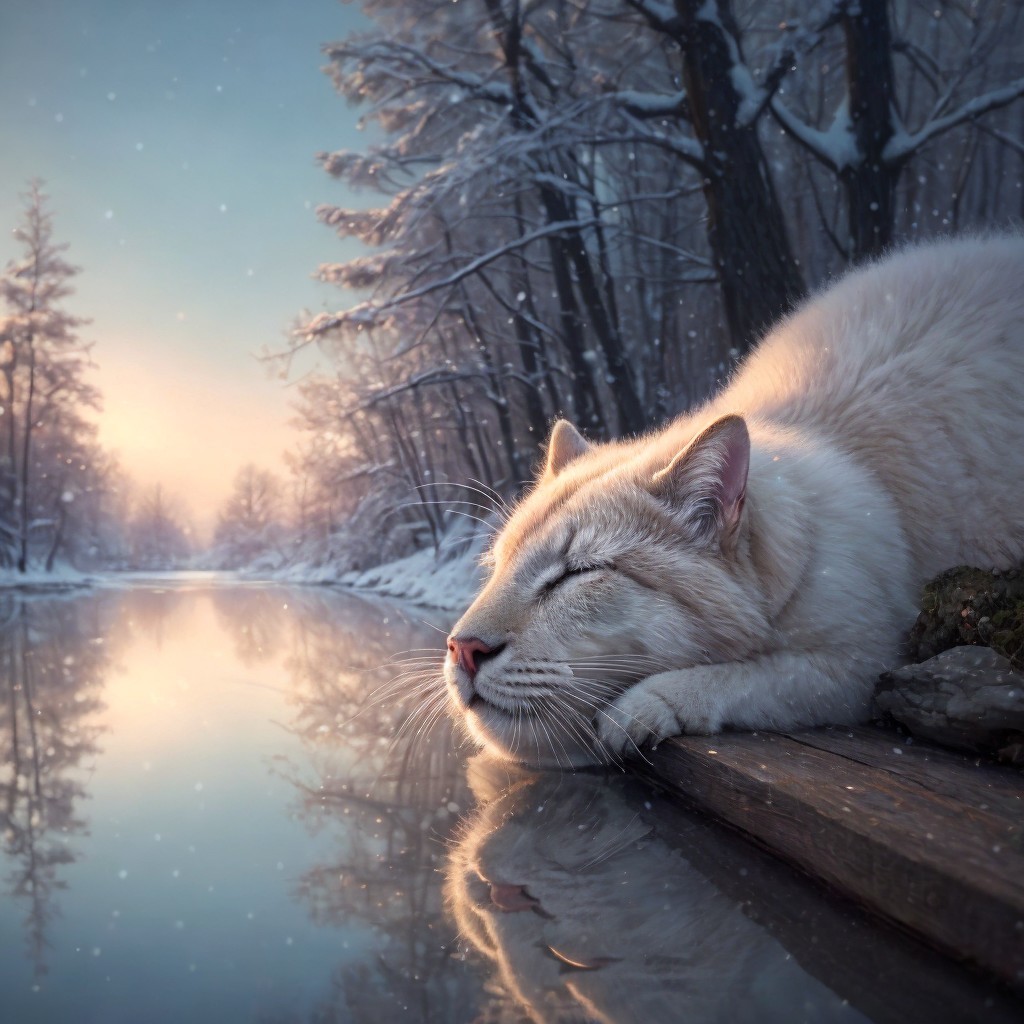 Description: A serene winter scene captures a fluffy animal peacefully sleeping, surrounded by snow-covered trees and softly falling snowflakes.
