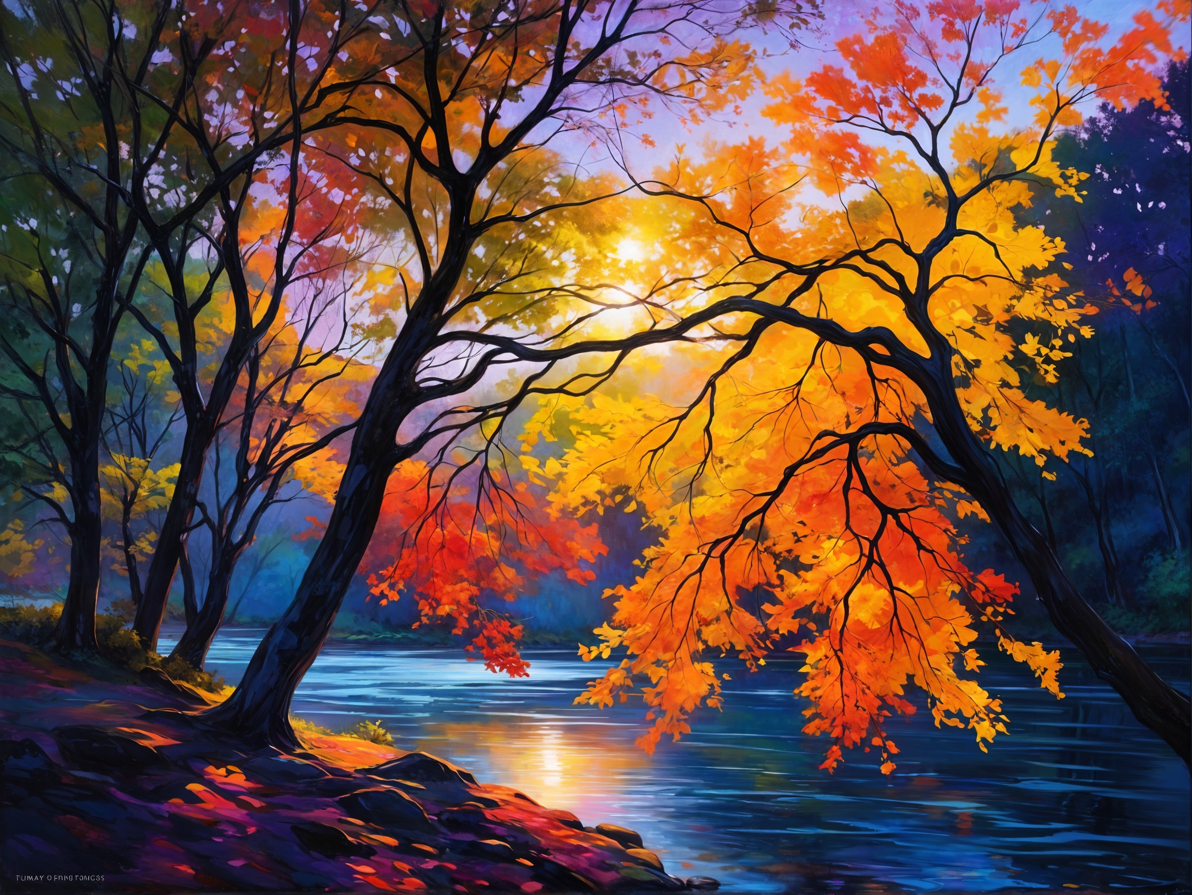 A vibrant sunset casts a colorful glow over a tranquil river, framed by silhouetted trees. The sky shifts from deep purple to warm orange, reflecting beautifully on the water's surface.