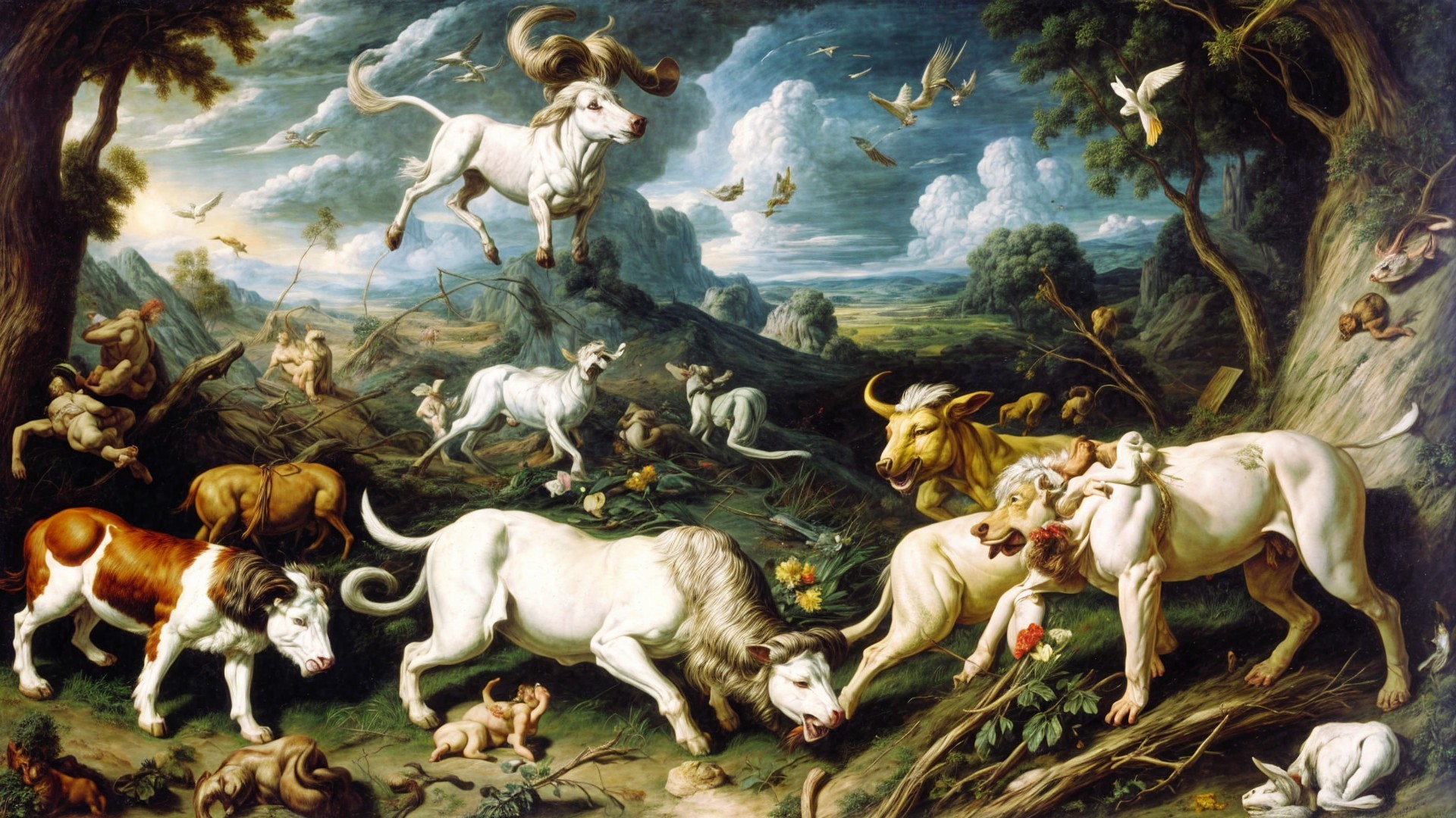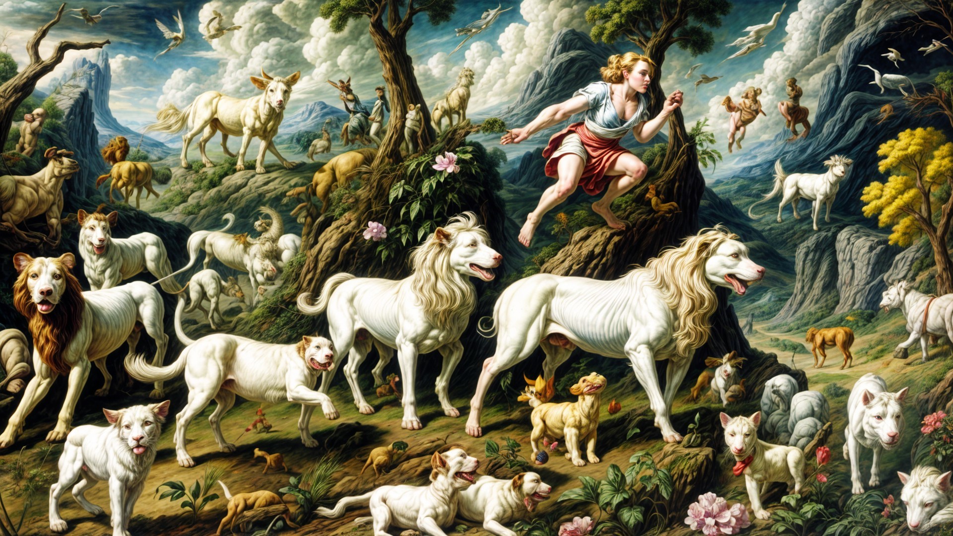 In a vibrant mountain landscape, a joyful woman in a yellow dress leads a pack of white dogs, surrounded by cheering people and soaring birds, capturing a spirit of freedom and happiness.