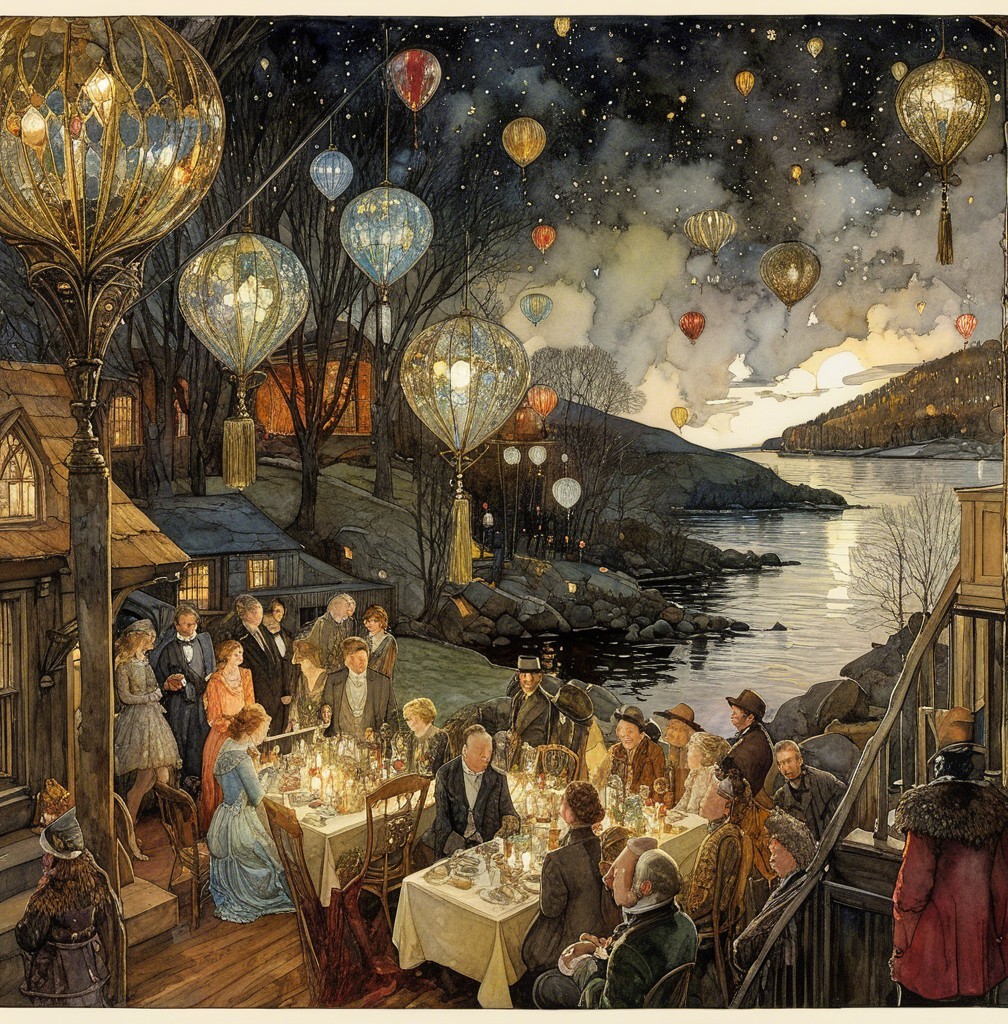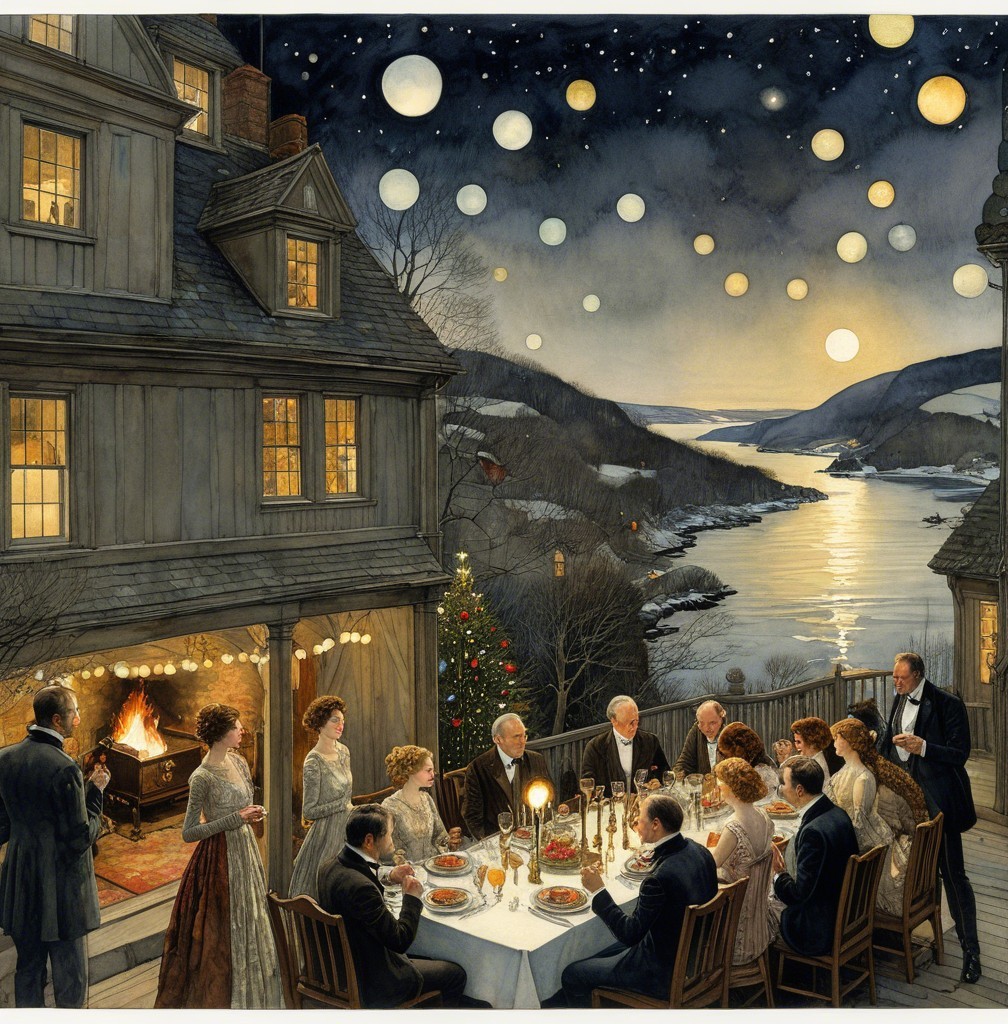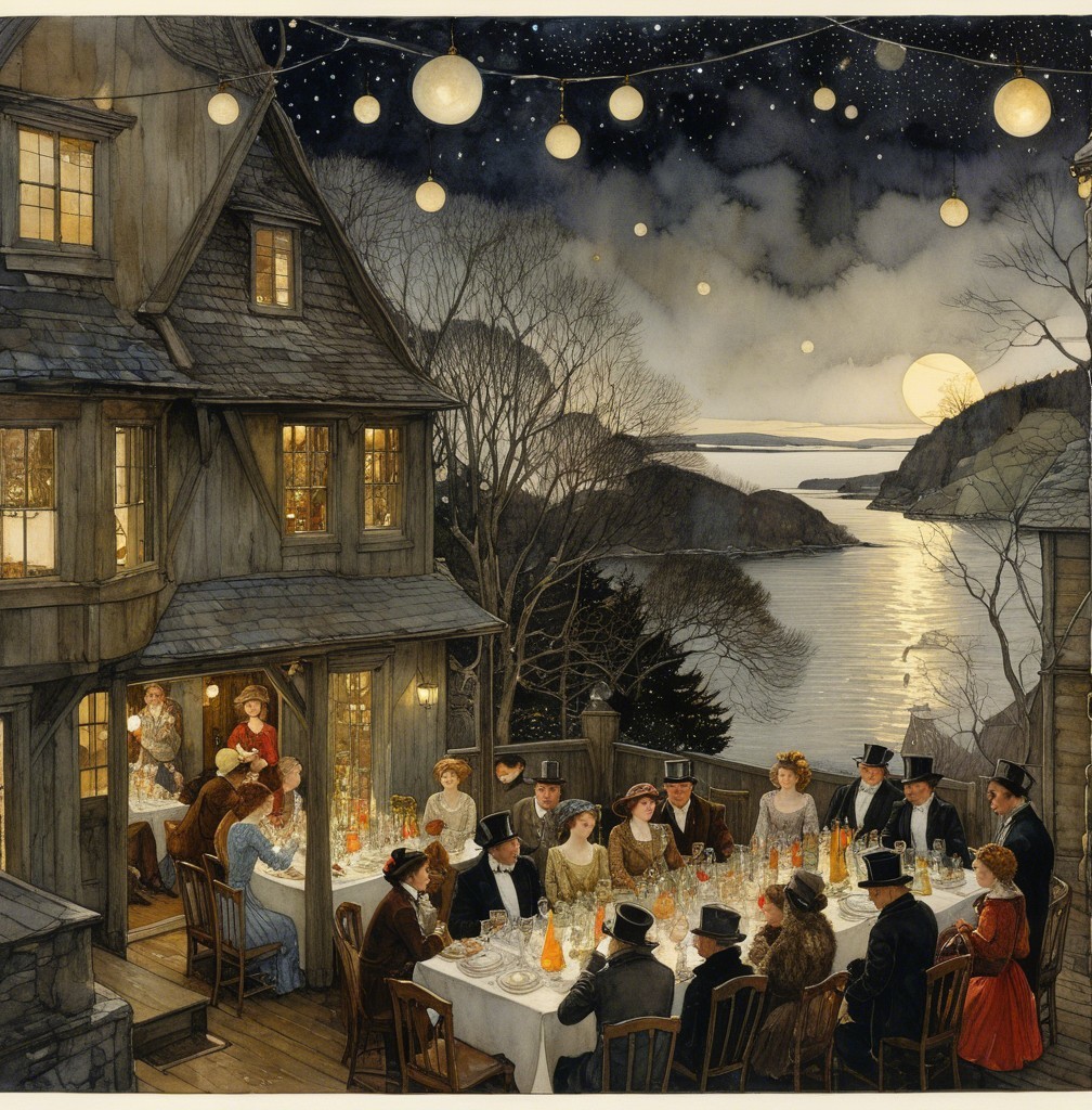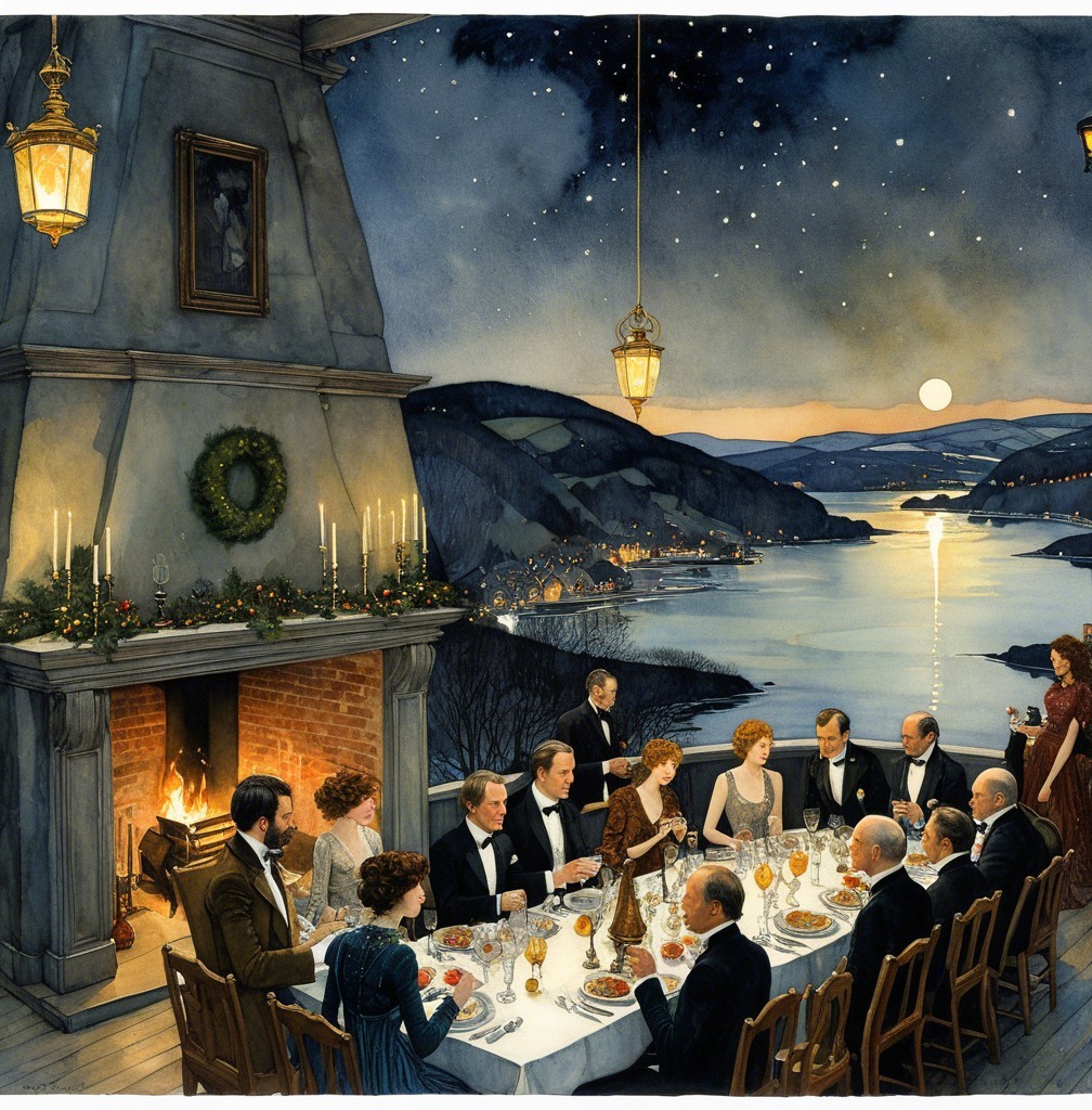 A lavish dinner party by a lakeside, under a starry night sky. Guests in elegant attire enjoy the feast by a crackling fireplace, with a moonlit landscape reflected in a mirror.