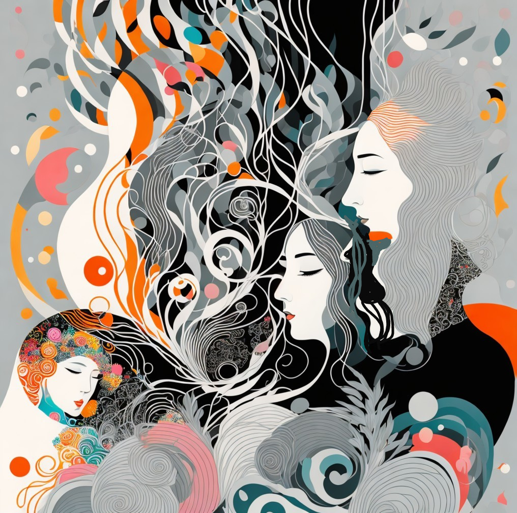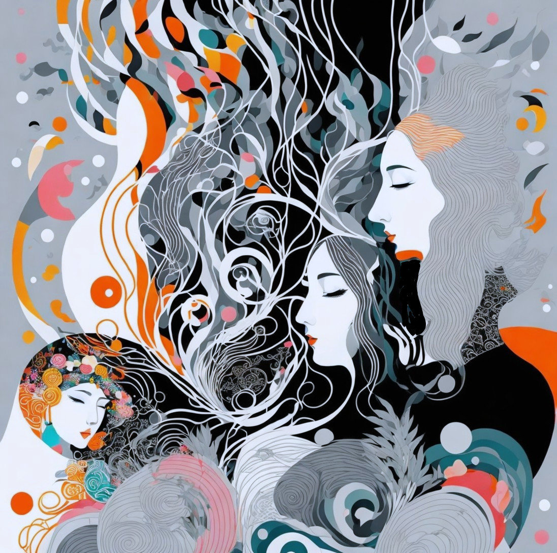 Abstract artwork with intertwined black and white patterned figures amidst colorful swirls and foliage, exuding a dreamy, mystical vibe.