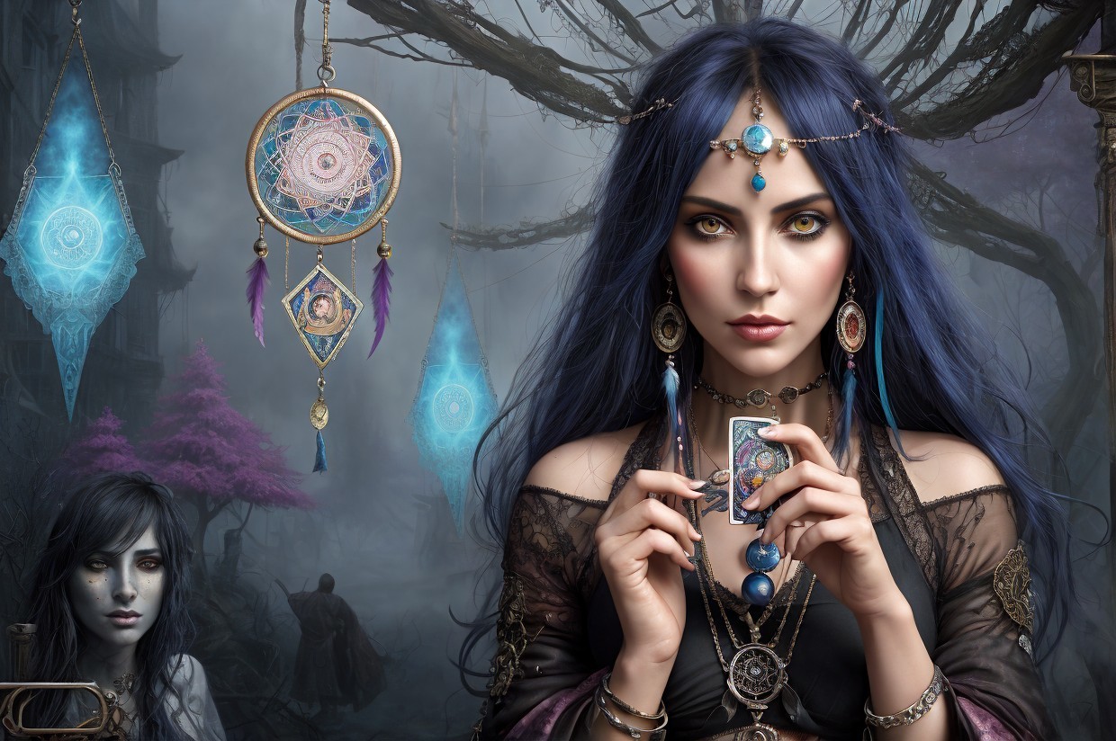 Prompt: A crazy tarot fortune teller holds a tarot card in one hand and a dream catcher in the other.