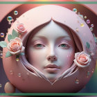 A surreal image depicting a woman's face framed by radiant sun-like features, glowing warmly. Her serene expression and luminous eyes create an ethereal, dreamlike atmosphere.