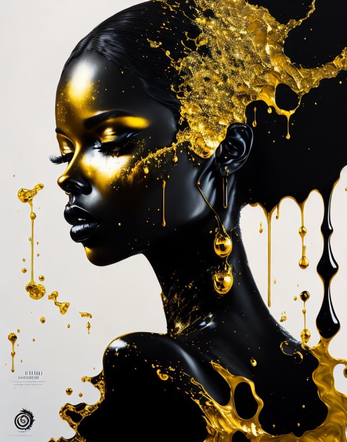 Prompt: "beautiful melting woman black and gold graffiti art, splash art, street art, spray paint, q a encaustic oil gouache melting, acrylic, high contrast, black and gold polychromatic, ultra detailed, ultra quality, CGSociety Hyperrealistic, splash art, concept art, mid shot, intricately detailed, color depth, dramatic, 2/3 face angle, side light, abstract background hyperdetailed charcoal drawing"