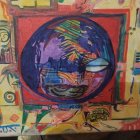 A vibrant abstract painting featuring a figure standing in a cosmic landscape. Bold colors swirl in the background, blending celestial elements with waves, creating a sense of wonder and exploration.